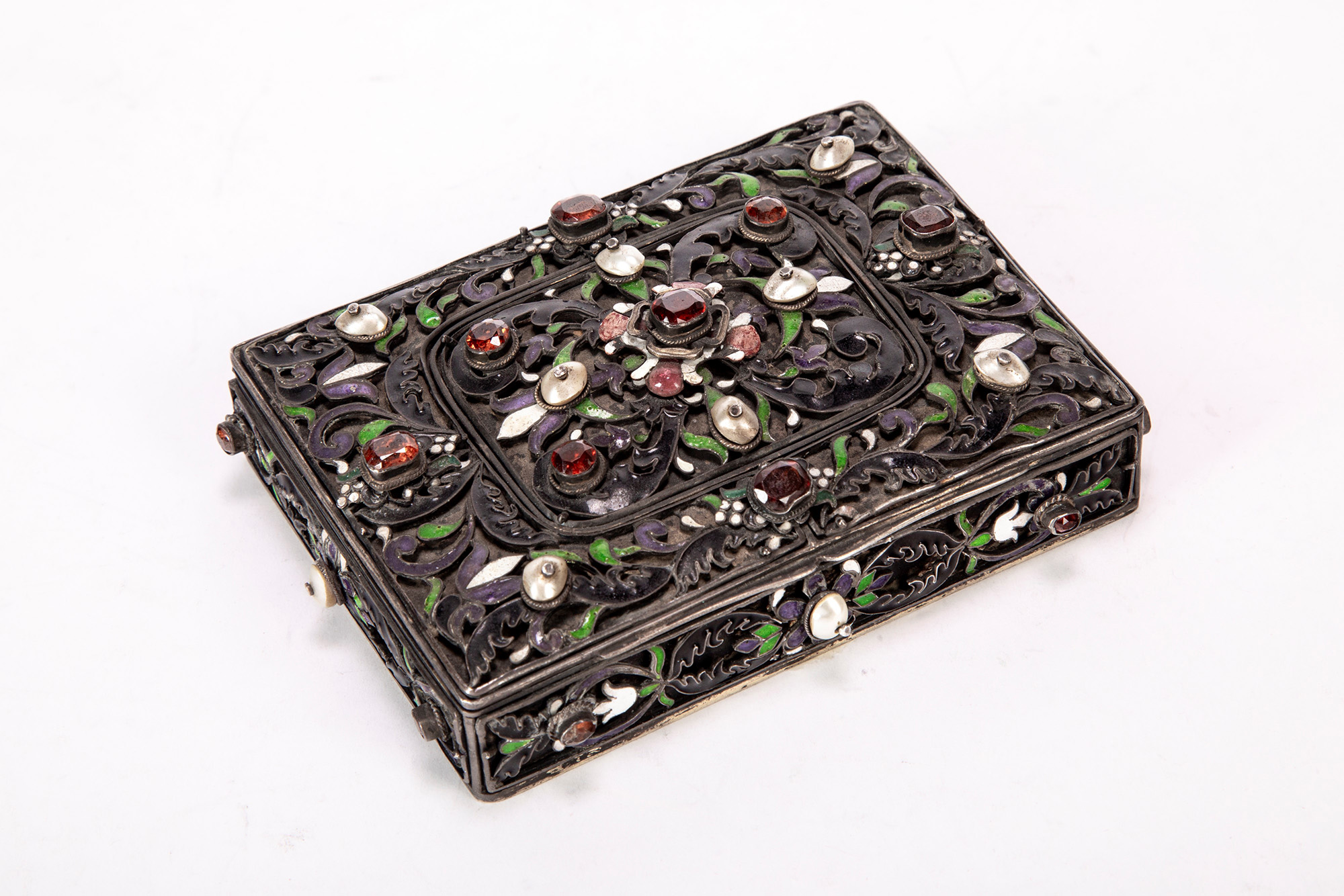 di forma rettangolare con corpo finemente decorato su tutti i lati a fregi con volute e applicazioni in quarzo, smalti e materiali diversi policromi, interno rivestito in velluto.
