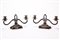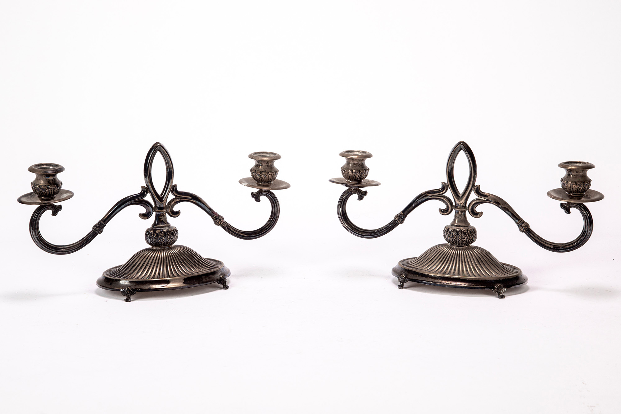 parte superiore a due braccia sagomate terminate con porta candele torniti, base ovale sbalzata sorrette da quattro piedini a ricciolo.