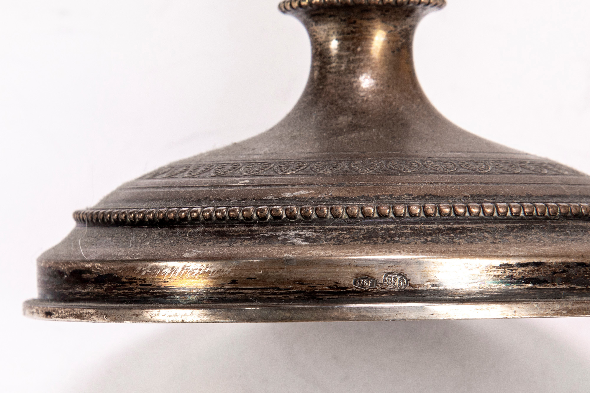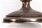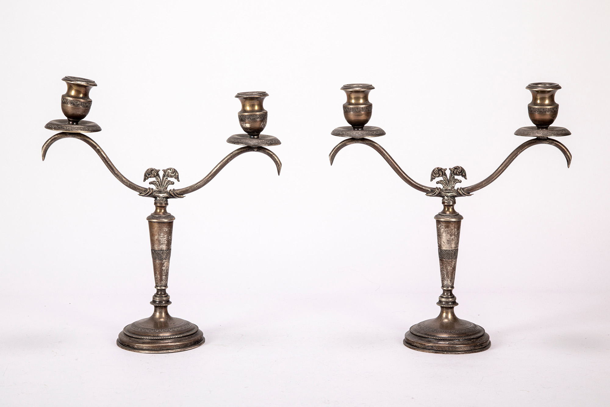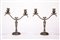 a due fiamme con braccia mosse terminanti al centro con foglie cesellate e base tornite.