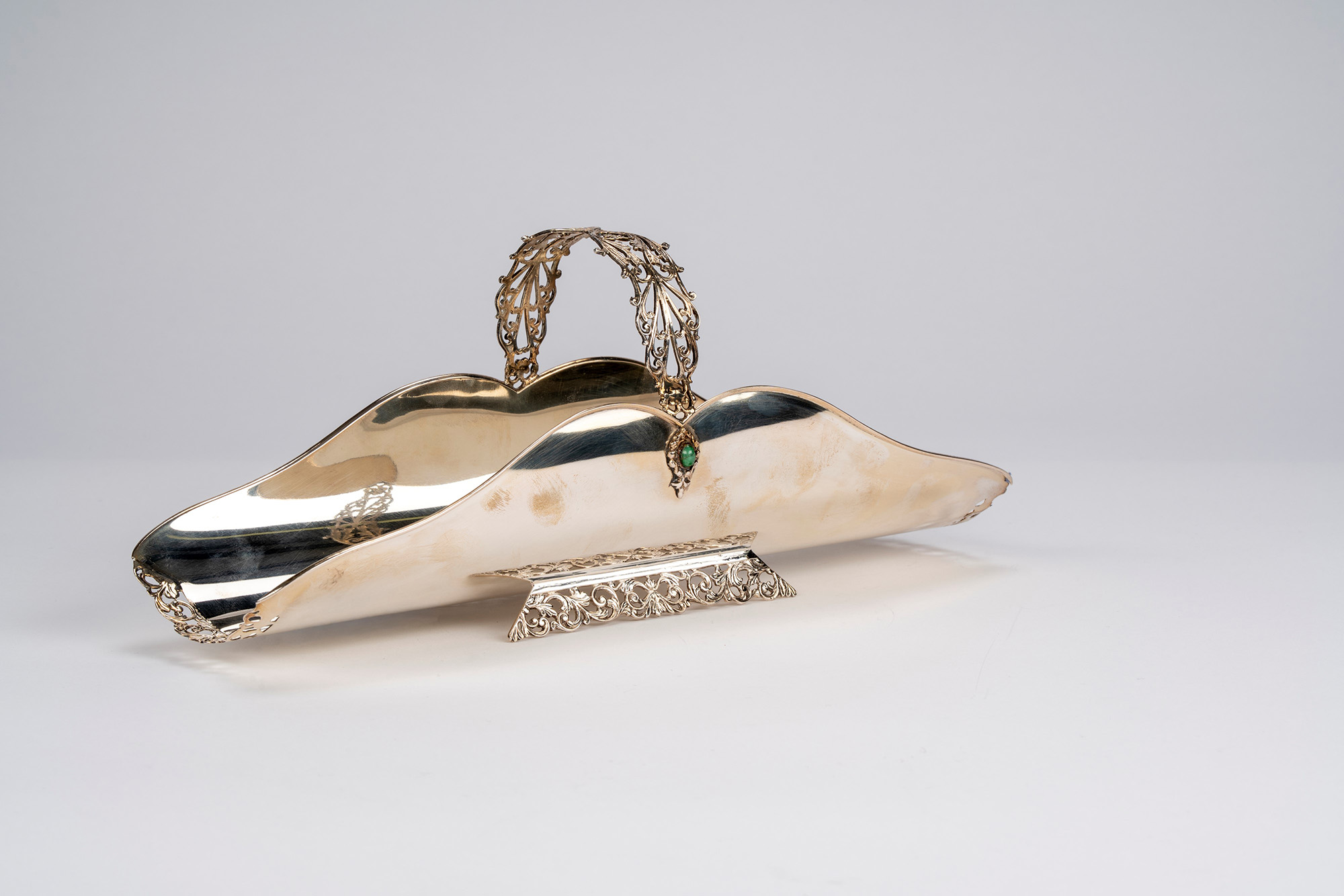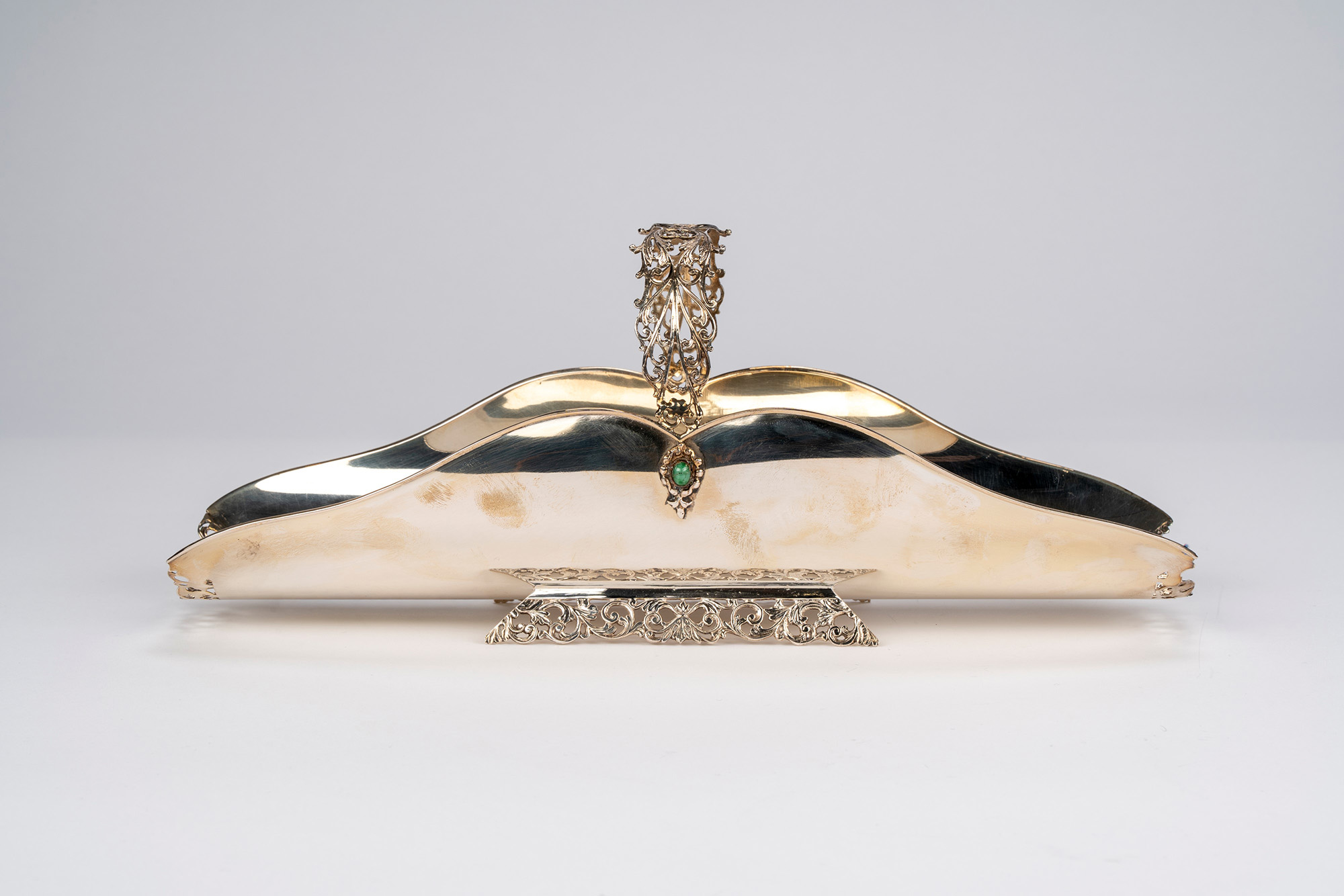decorato con presa, bordi e base traforata a volute e riccioli, ai lati due piccoli decori cabochon in pietra dura.
