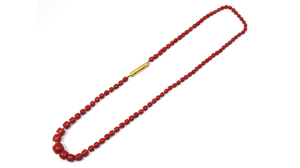 COLLANA SCALARE IN CORALLO ROSSO MEDITERRANEO chicchi a barilotto sfaccettato, fermezza in oro giallo lung cm 80 circa, diam mm 6,5/18, gr 100,8 GRADUATED BARREL-SHAPED MEDITERRANEAN RED CORAL NECKLACE, YELLOW GOLD CLASP