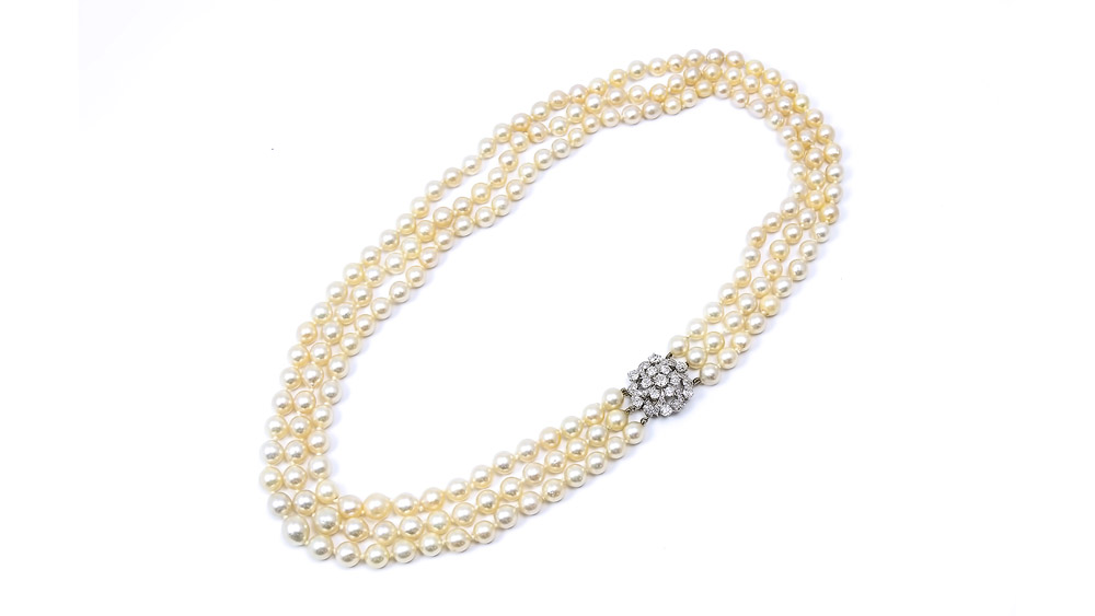 COLLANA A TRE FILI IN PERLE COLTIVATE DEGRADÉ impreziosita da fermezza laterale in oro bianco e diamanti taglio vecchio disposti a formare un rosone circolare diam mm 8/10, lungh cm 54, ct 2,0 circa PEARL AND DIAMOND NECKLACE
