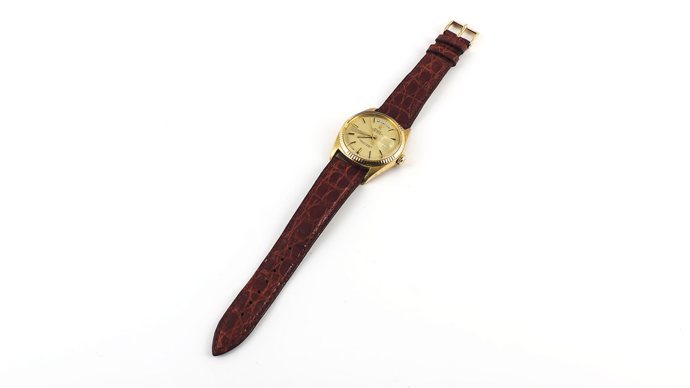 OROLOGIO DA POLSO IN ORO GIALLO Rolex Oyster Perpetual Day Date quadrante dorato, cinturino in pelle non pertinente Corredato da scatola, ref. 1803, n° 2978175 ROLEX OYSTER PERPETUAL DAY DATE GENTLEMAN'S YELLOW GOLD WRISTWATCH, GOLD-TONED DIAL, LEATHER STRAPS, ORIGINAL BOX. REF. 1803, SERIALE N. 2978175