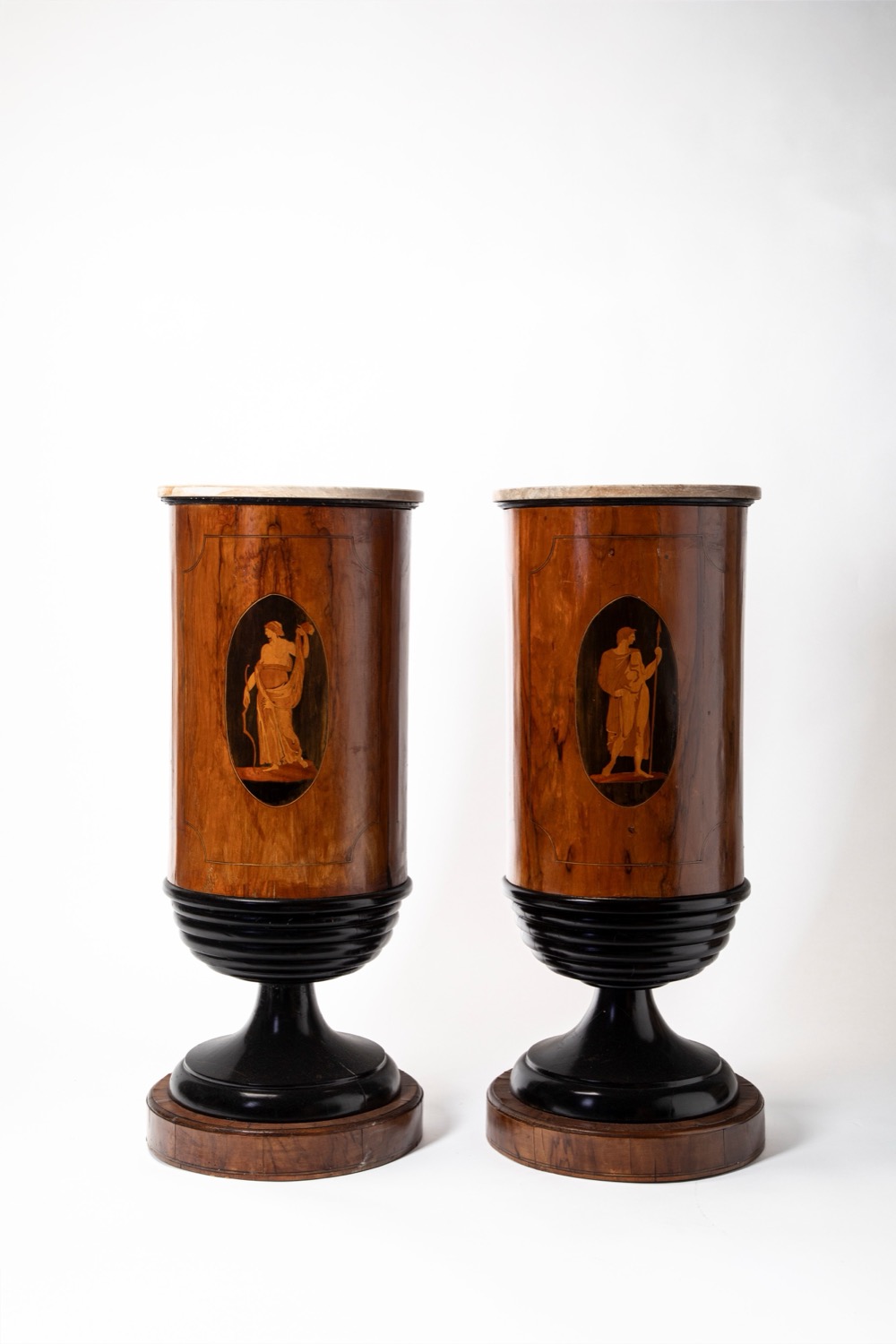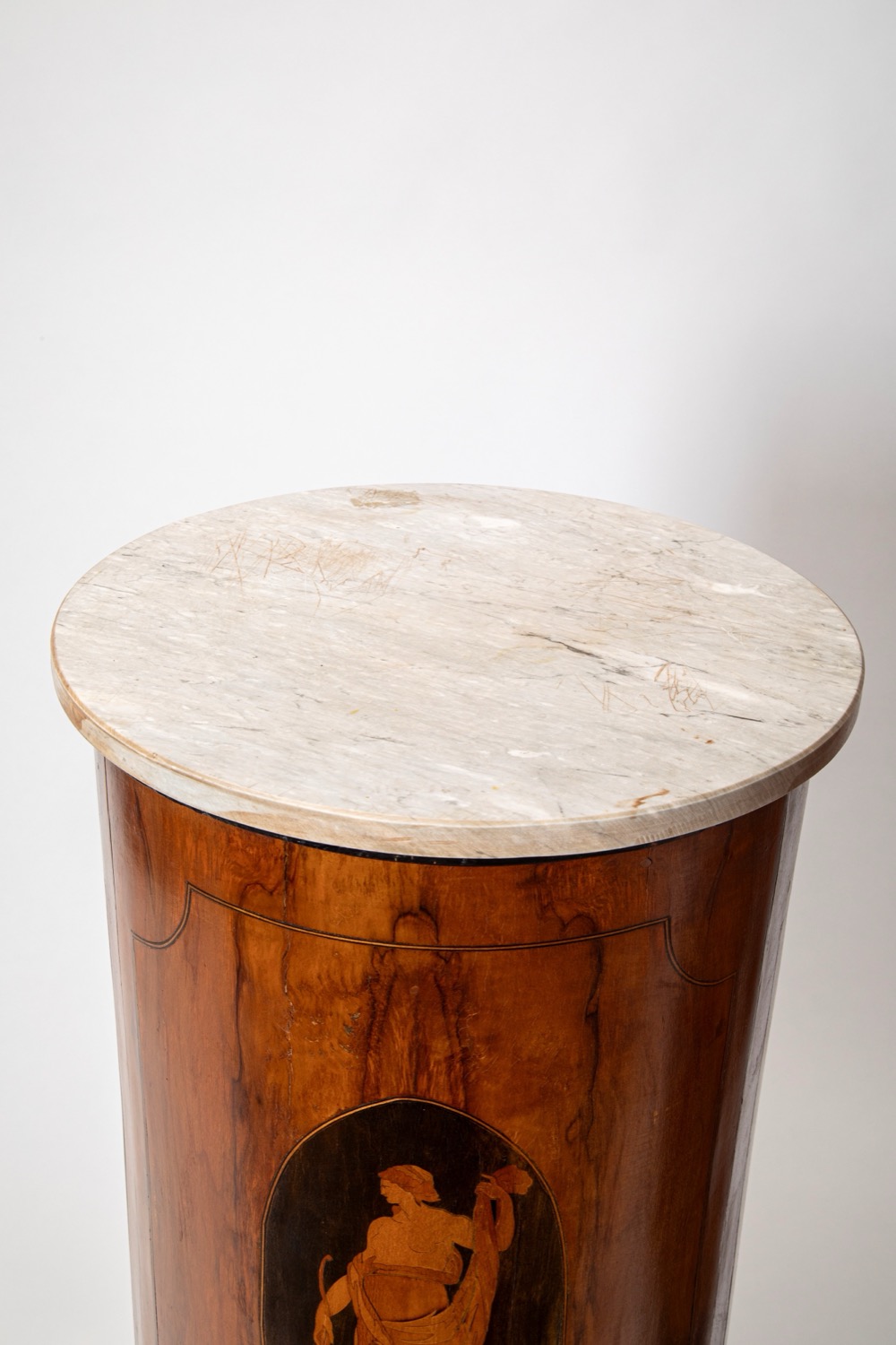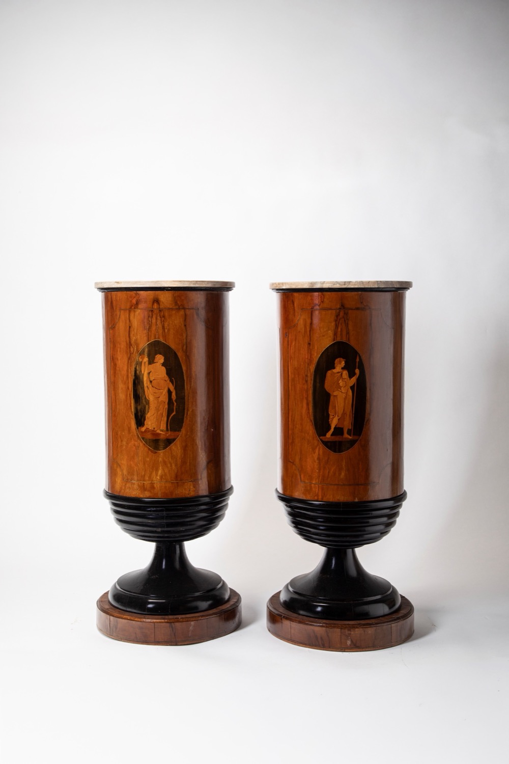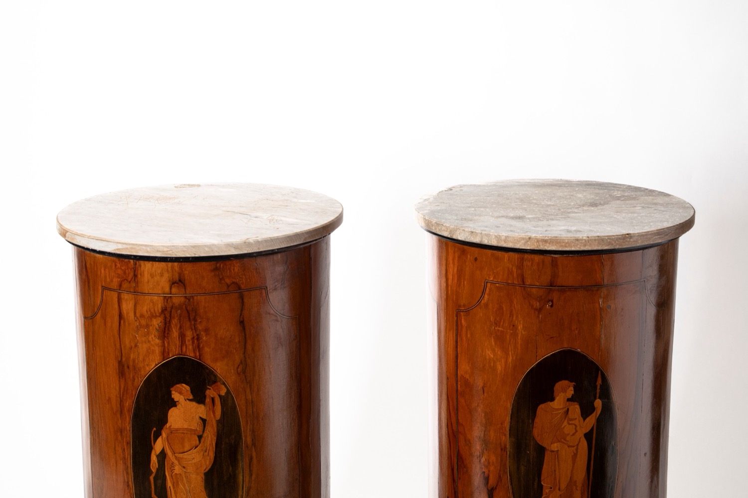 Coppia di gueridon a cilindro in legno lastronato e intarsiato con piani in marmo. Secolo XIX