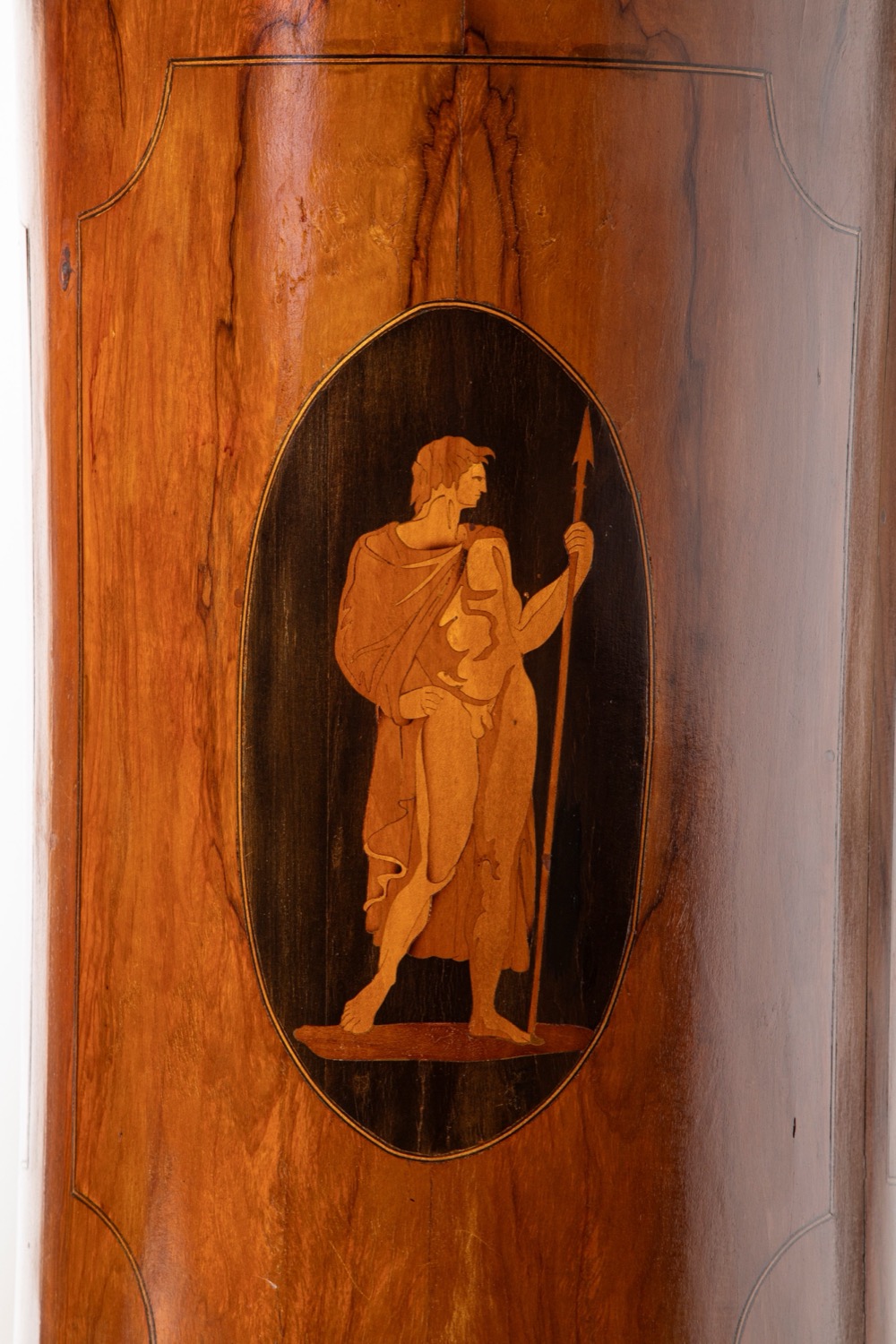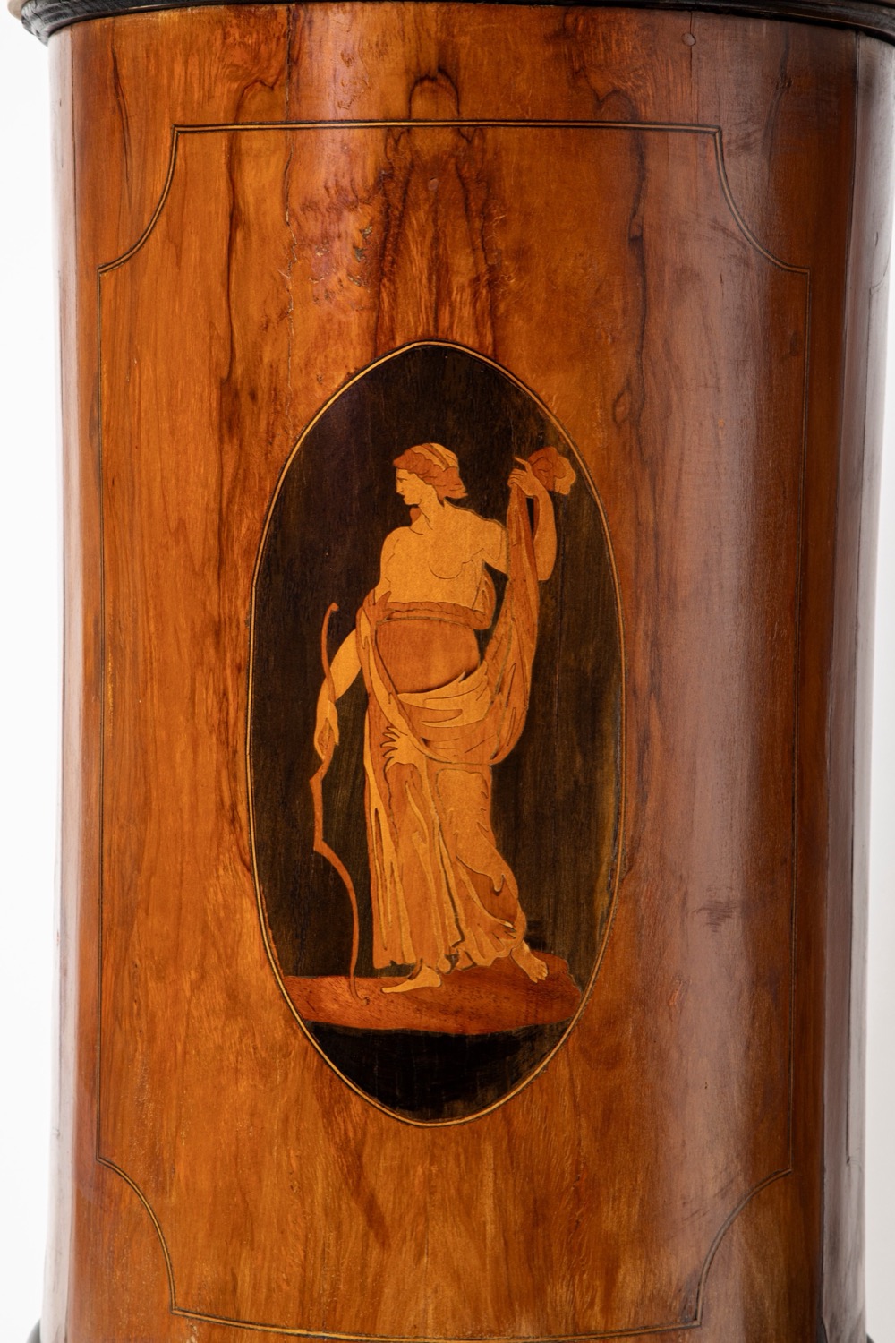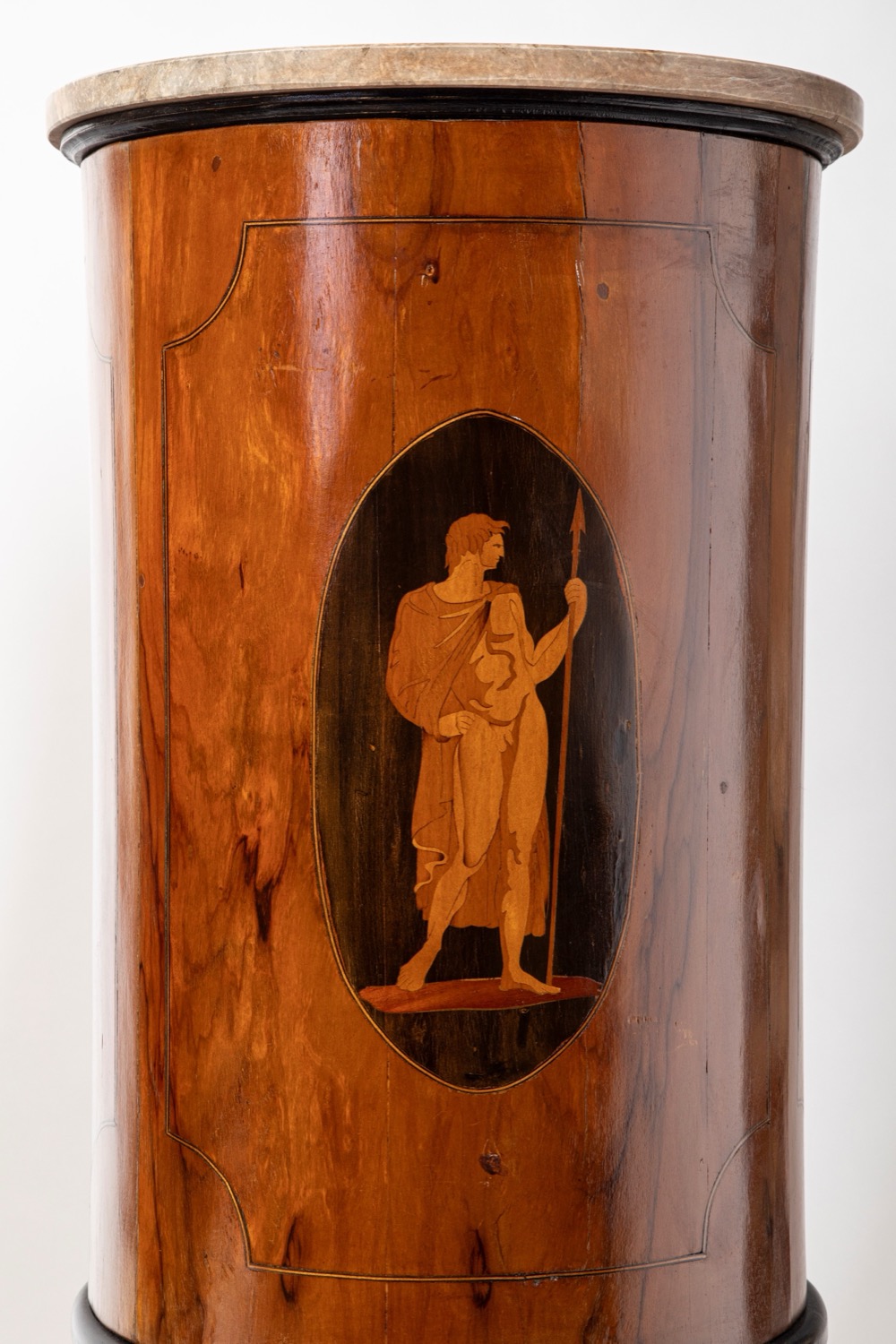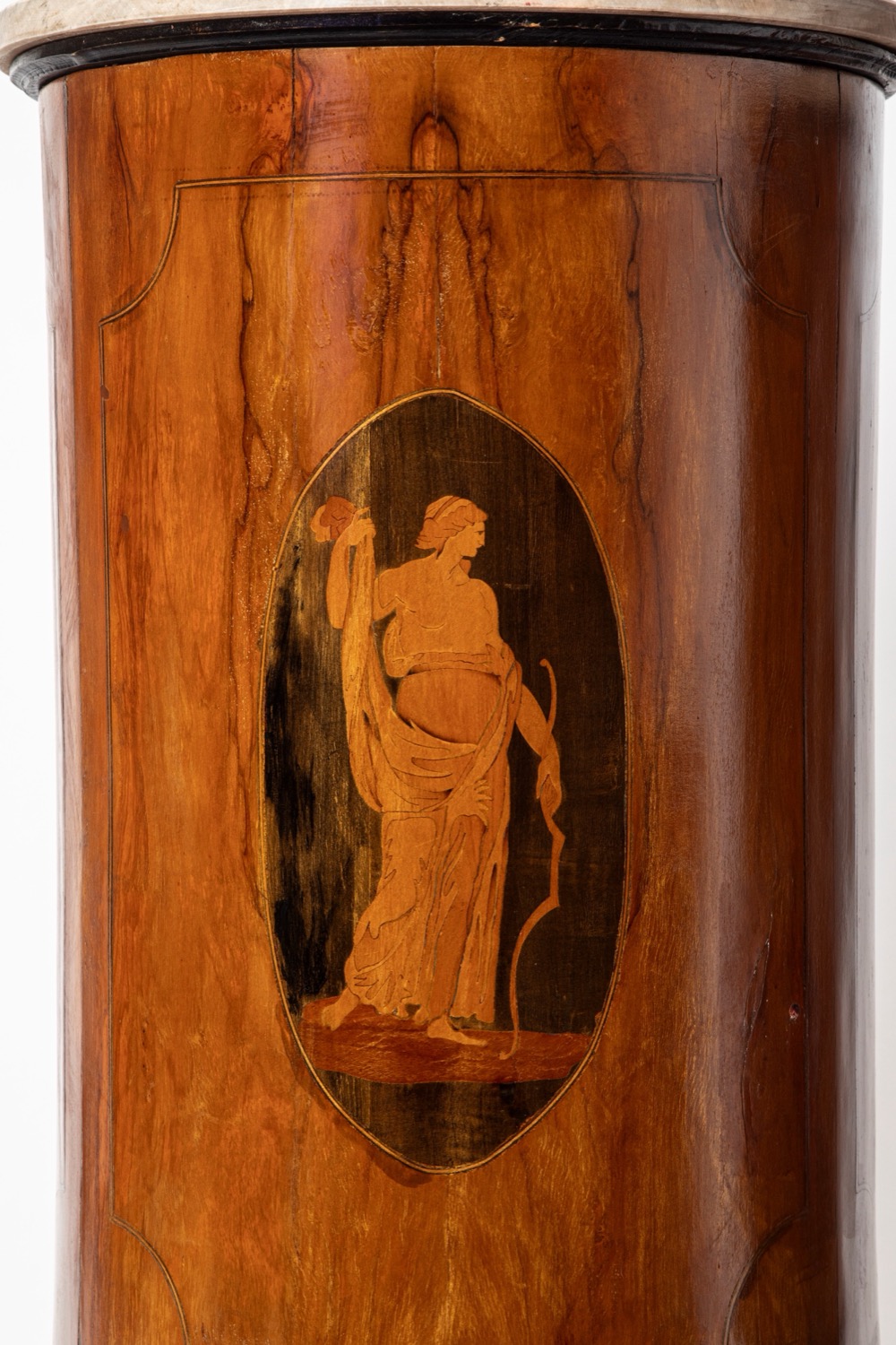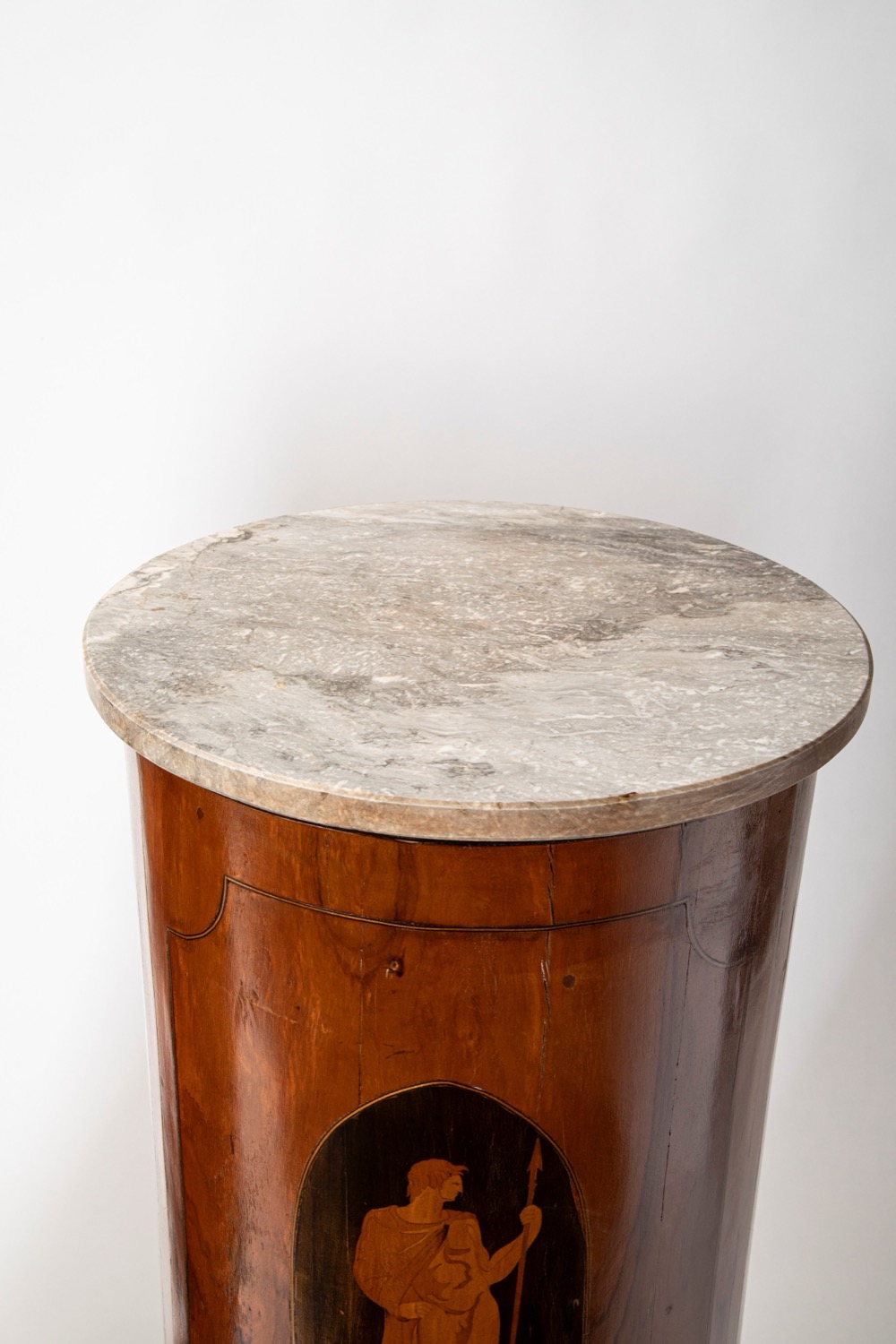 Coppia di gueridon a cilindro in legno lastronato e intarsiato con piani in marmo. Secolo XIX