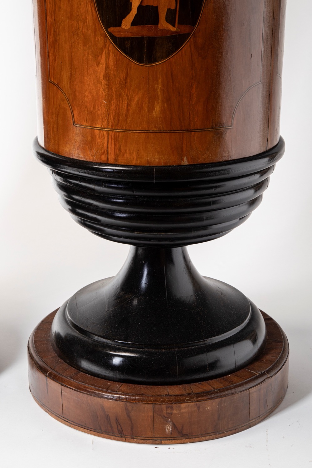 Lot 1 | Coppia di gueridon a cilindro in legno lastronato e intarsiato con piani in marmo. Secolo XIX