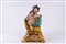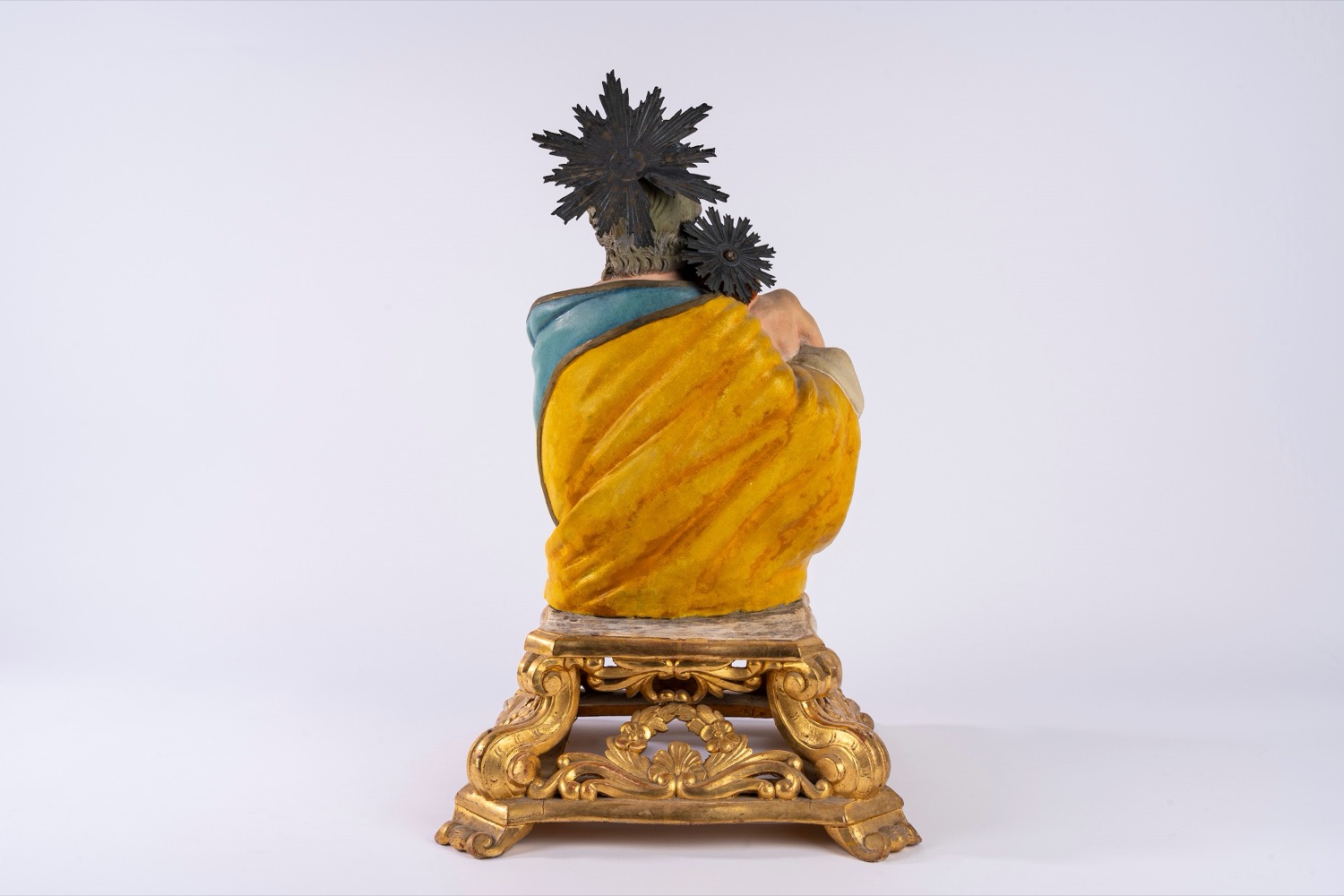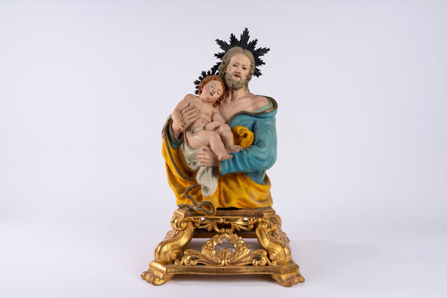 San Giuseppe con Bambino, scultura in terracotta policroma con applicazioni in metallo argentato. Su base in legno dorato traforata a volute e corolle di fiori. Napoli, secolo XIX.