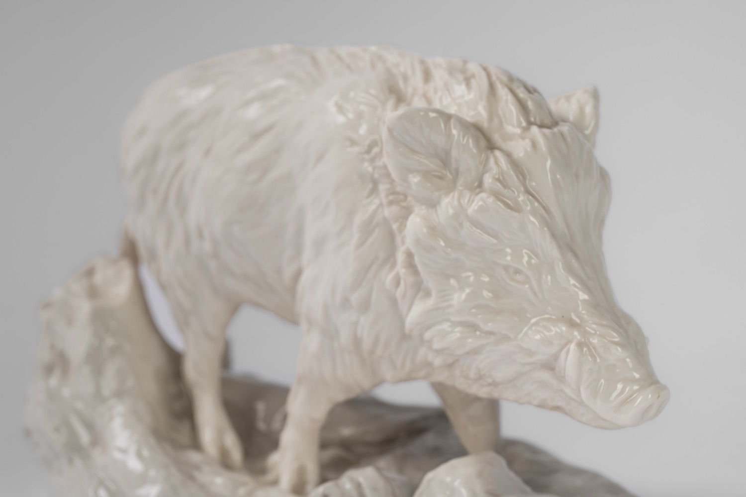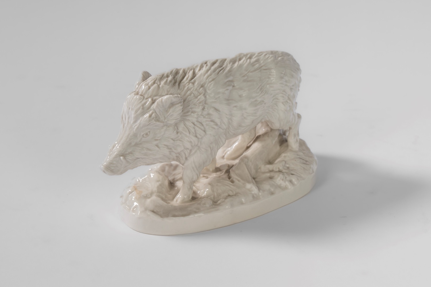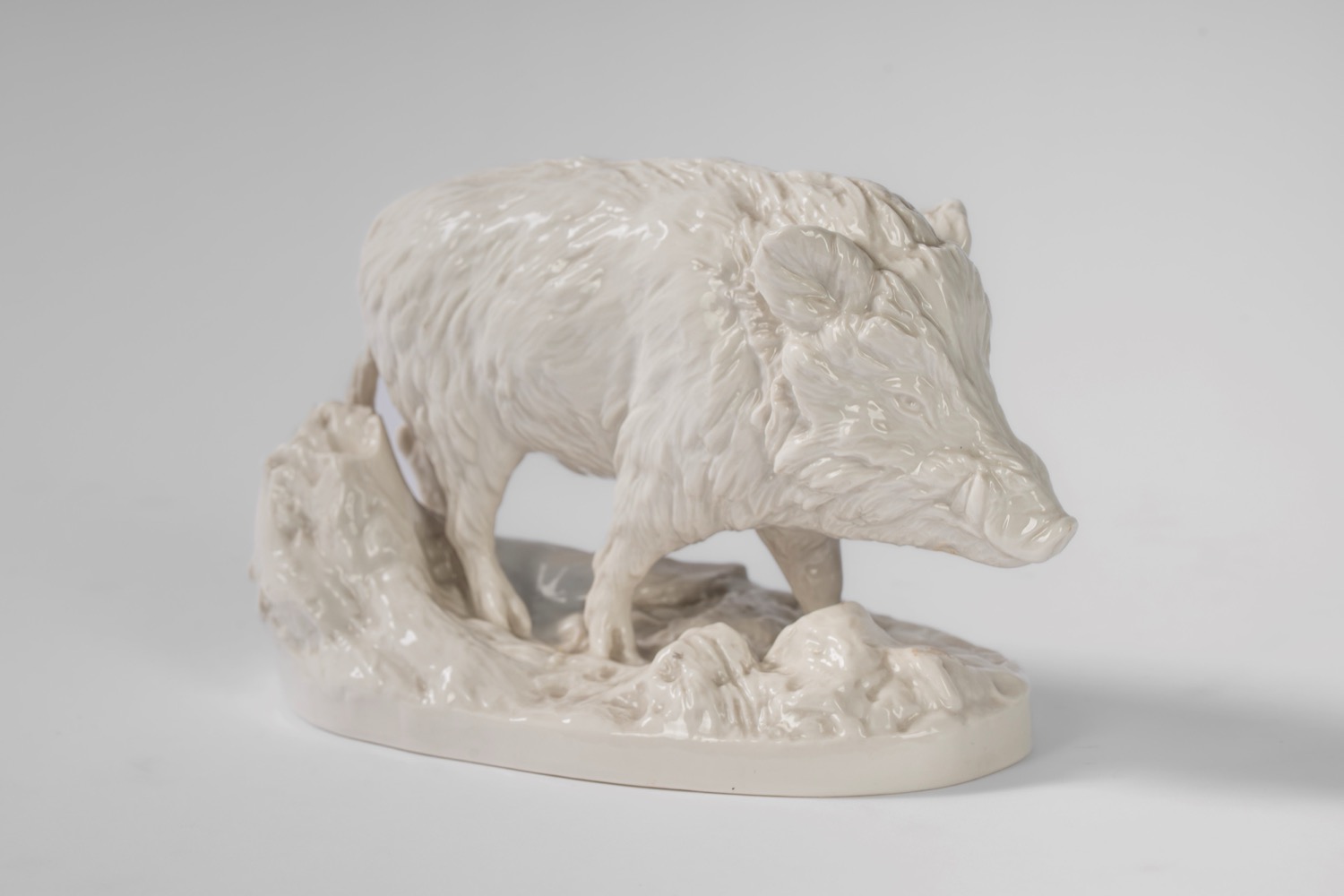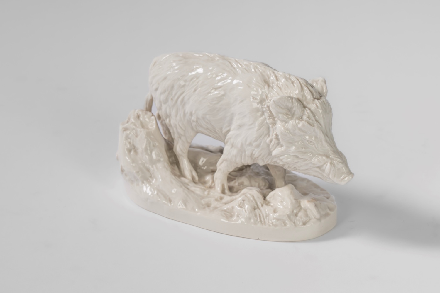 Cinghiale selvatico su base ovale a zolla boschiva in porcellana bianca. Nymphenburg, inizio secolo XX