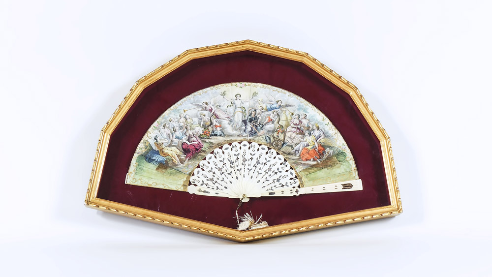 VENTAGLIO seonda metà del XIX secolo pagina in carta incisa e acquerellata con scena allegorica, stecche in avorio intagliato, entro cornice a teca FAN, 19TH CENTURY