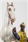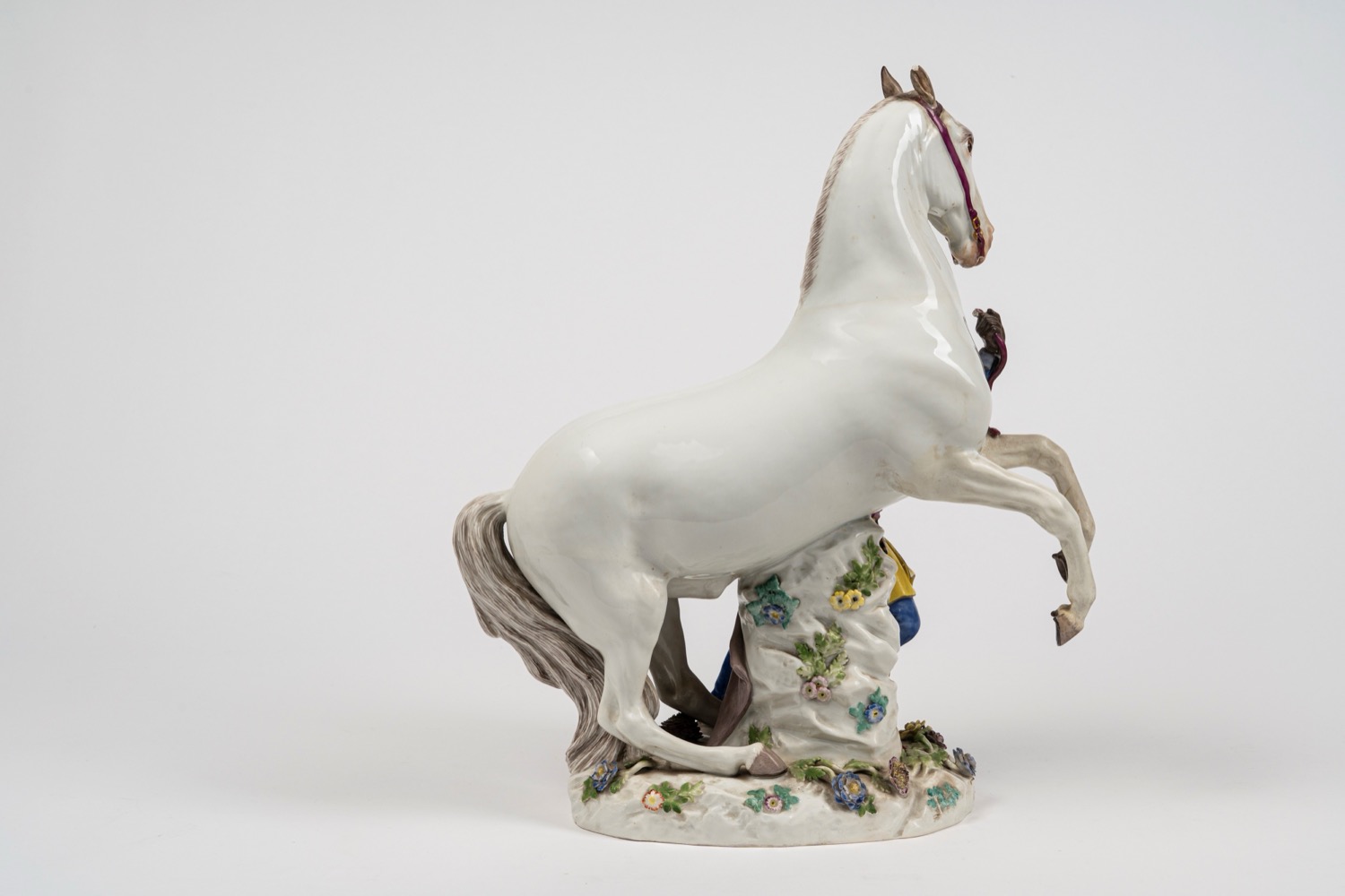 Da un modello di Johann Joachim Kändler 1748 Raffigura un uomo in abiti orientali mentre tiene le briglie di un cavallo bianco impennato su una base a zolla di fiori e foglie. Rottura alla briglia, mancanze ai fiori, sbeccatura all'orecchio. Da un modello di Johann Joachim Kändler 1748 Raffigura un uomo in abiti orientali mentre tiene le briglie di un cavallo bianco impennato su una base a zolla di fiori e foglie. Rottura alla briglia, mancanze ai fiori, sbeccatura all'orecchio.