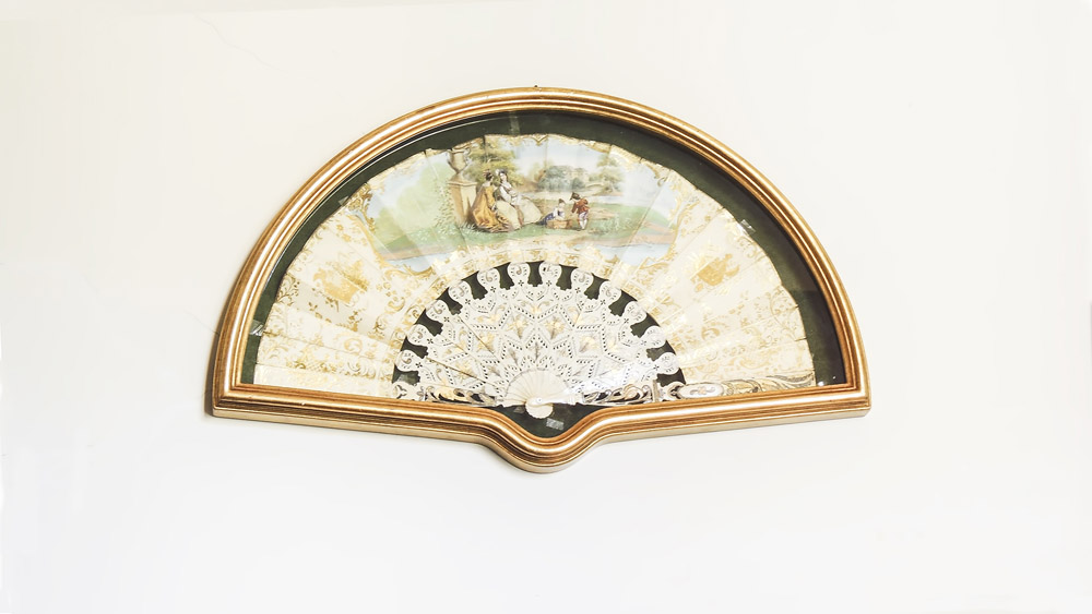 VENTAGLIO seconda metà del XIX secolo stecche in avorio traforato e in parte dorato, pagina in carta stampata e dipinta con Gentildonne e bambini in giardino, lievi difetti, entro cornice a teca in legno dorato cm 35x58 FAN, SECOND HALF OF 19TH CENTURY