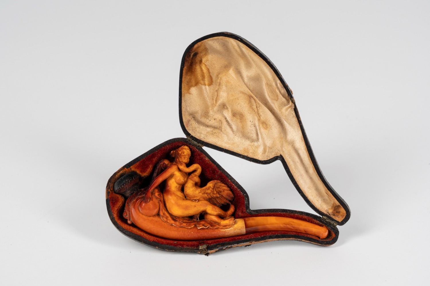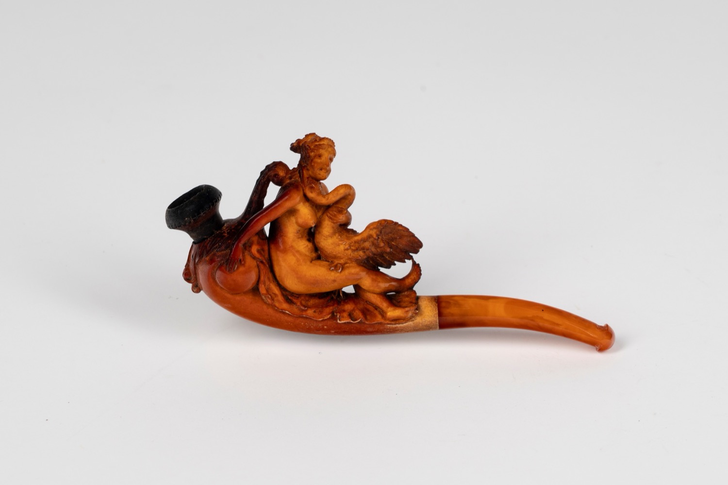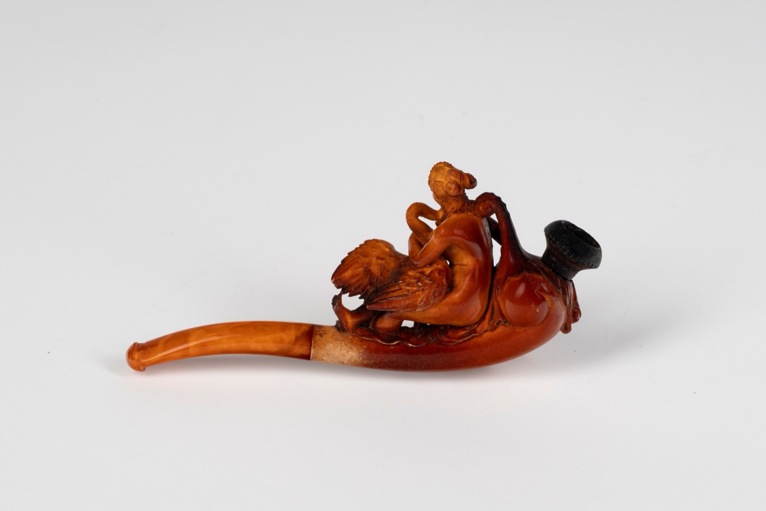 Pipa in schiuma di mare intagliata raffigurante Leda e il cigno. Secolo XIX