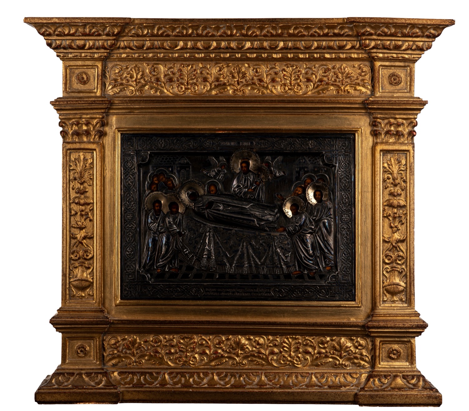 Lot 54 | Icona su tavola della Dormizione della Santissima Madre di Dio con riza in metallo argentato sbalzato e dorato. Russia, secolo XIX