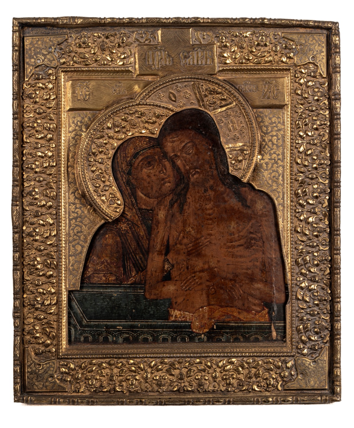 Icona della Passione con Cristo a mezzo busto con le braccia incrociate sul petto, affiancato dalla Madre. In alto iscrizione “ЦРЬ СЛАВЫ” (“Re della Gloria”) e sigla “IC XC”. Oklad in argento dorato con decorazione fitta a motivi vegetali e cartigli con iscrizioni. Icona della Passione con Cristo a mezzo busto con le braccia incrociate sul petto, affiancato dalla Madre. In alto iscrizione “ЦРЬ СЛАВЫ” (“Re della Gloria”) e sigla “IC XC”. Oklad in argento dorato con decorazione fitta a motivi vegetali e cartigli con iscrizioni.