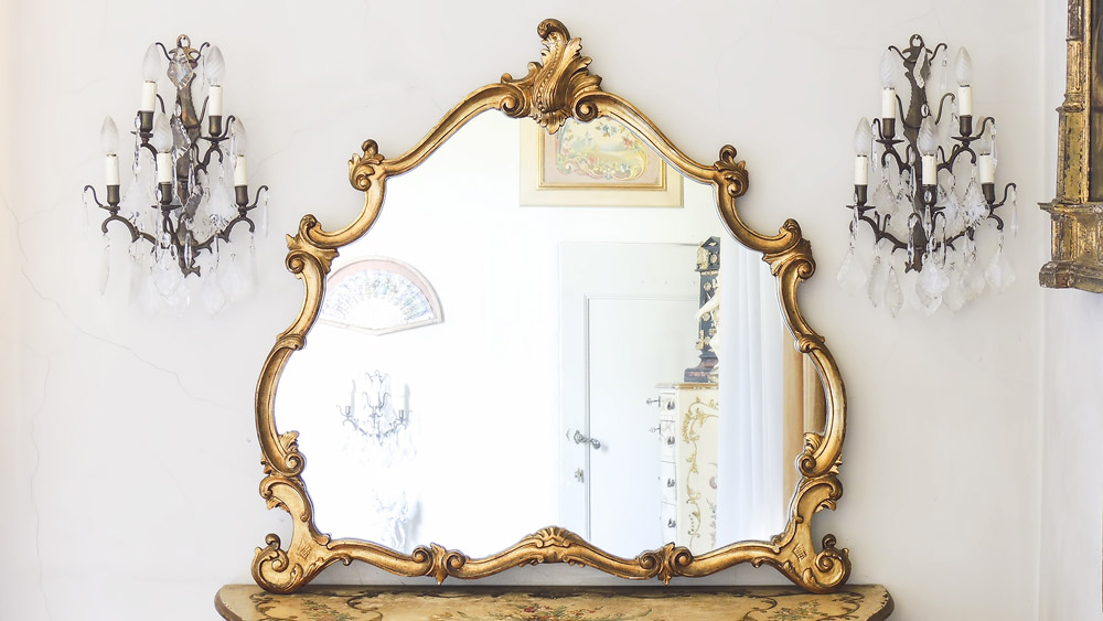 SPECCHIERA IN LEGNO DORATO forma sagomata realizzata a volute contrapposte, cimasa centrata da fiamma, piedi a ricciolo, difetti cm 103x105 GILTWOOD MIRROR