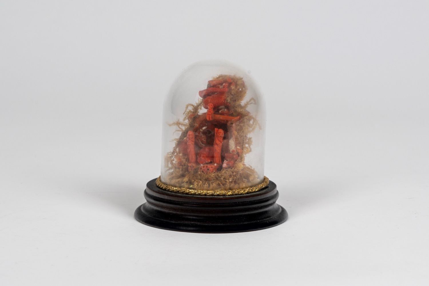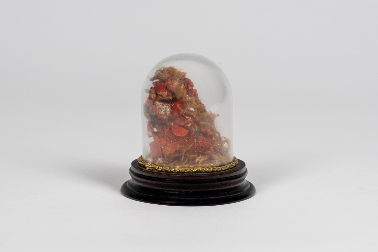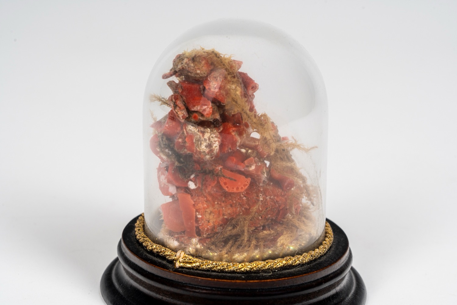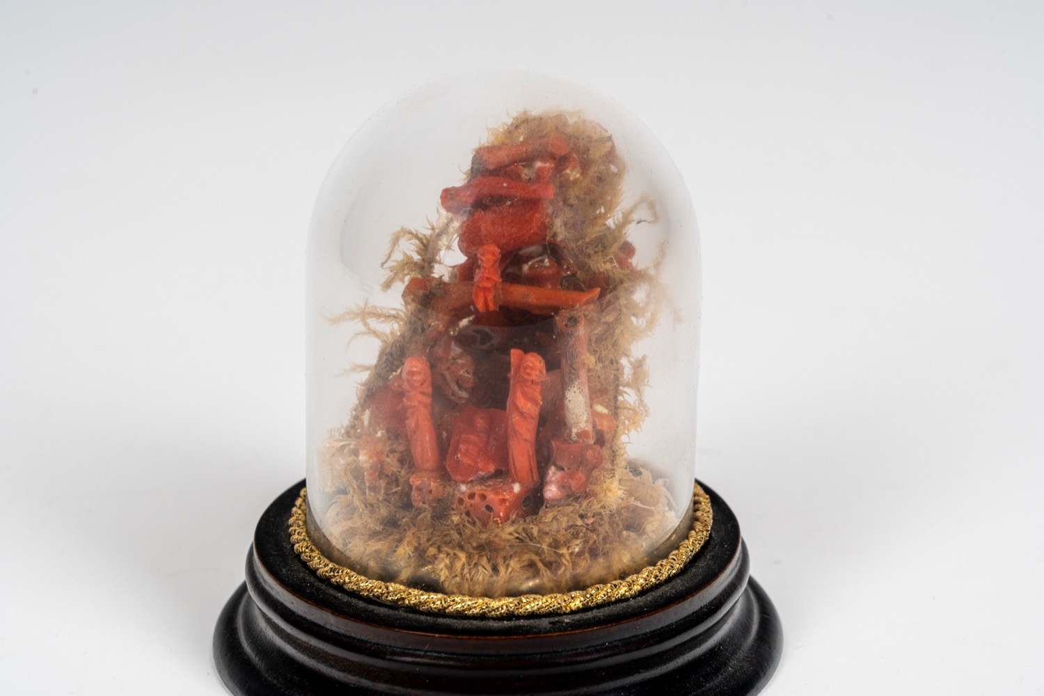 Lotto accompagnato da perizia per il corallo. Entro campana di vetro, su base circolare e modanata in legno laccato.