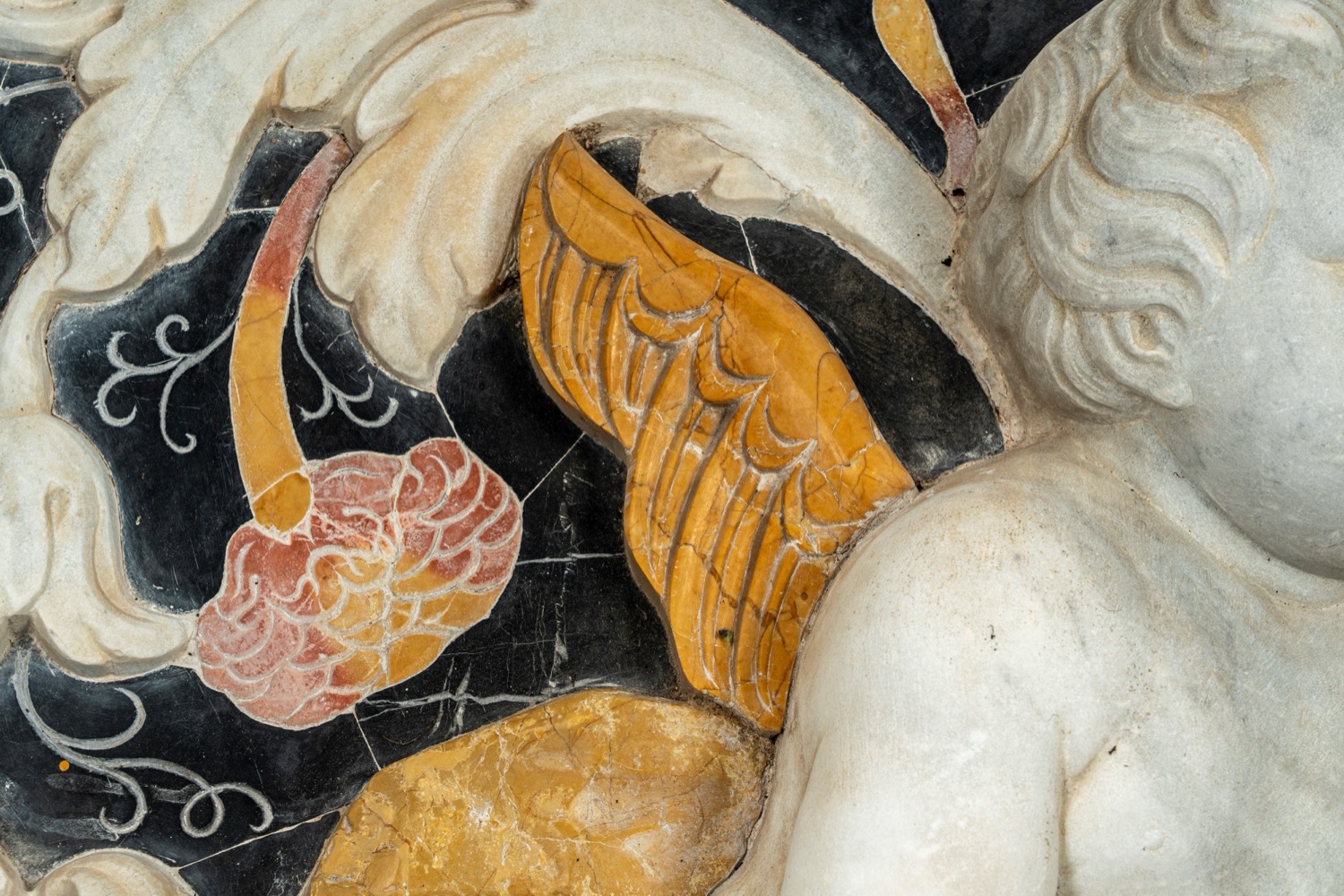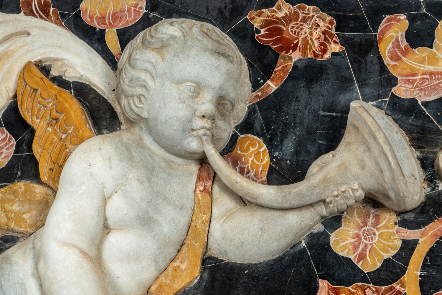 Importante pannello a tecnica mista in marmo scolpito e intarsiato raffigurante putto tra girali fogliati. Palermo, secolo XVIII