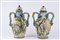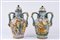 Coppia di vasi ad anfora con coperchio in maiolica policroma istoriata a scene mitologiche con anse serpentine. Manifattura dell’Italia meridionale, secolo XIX.