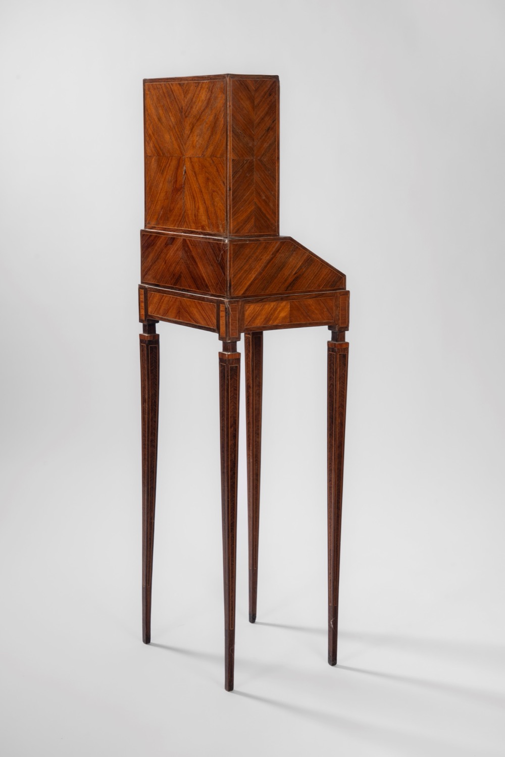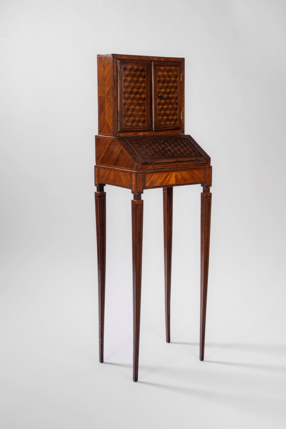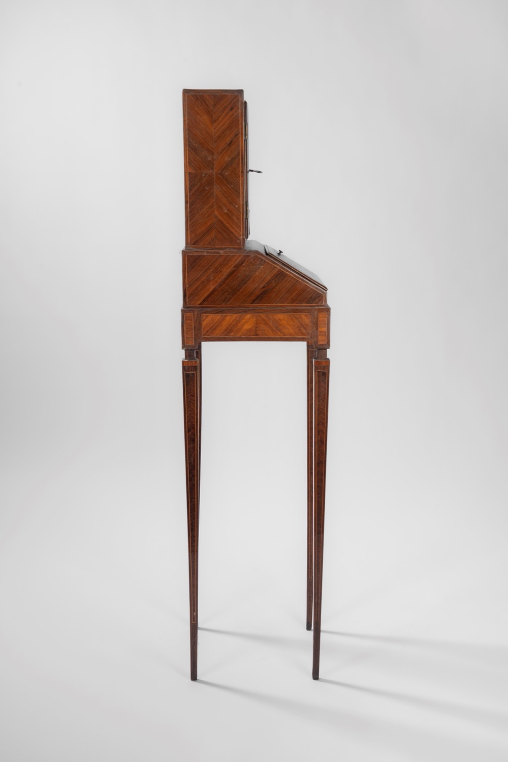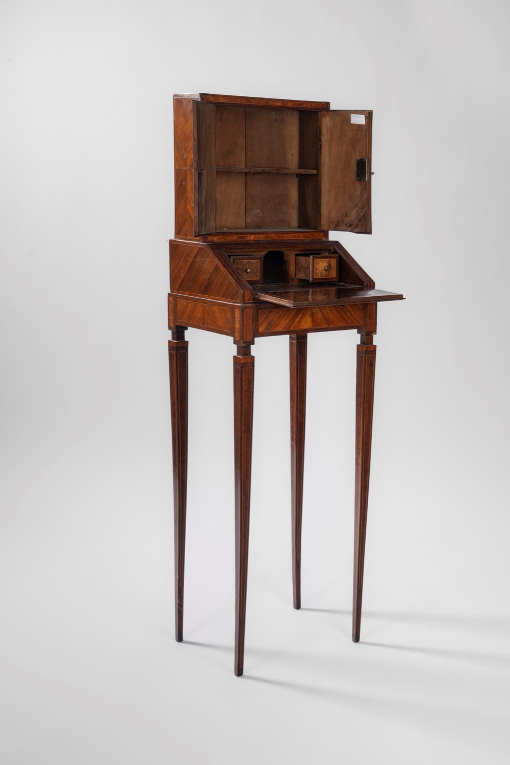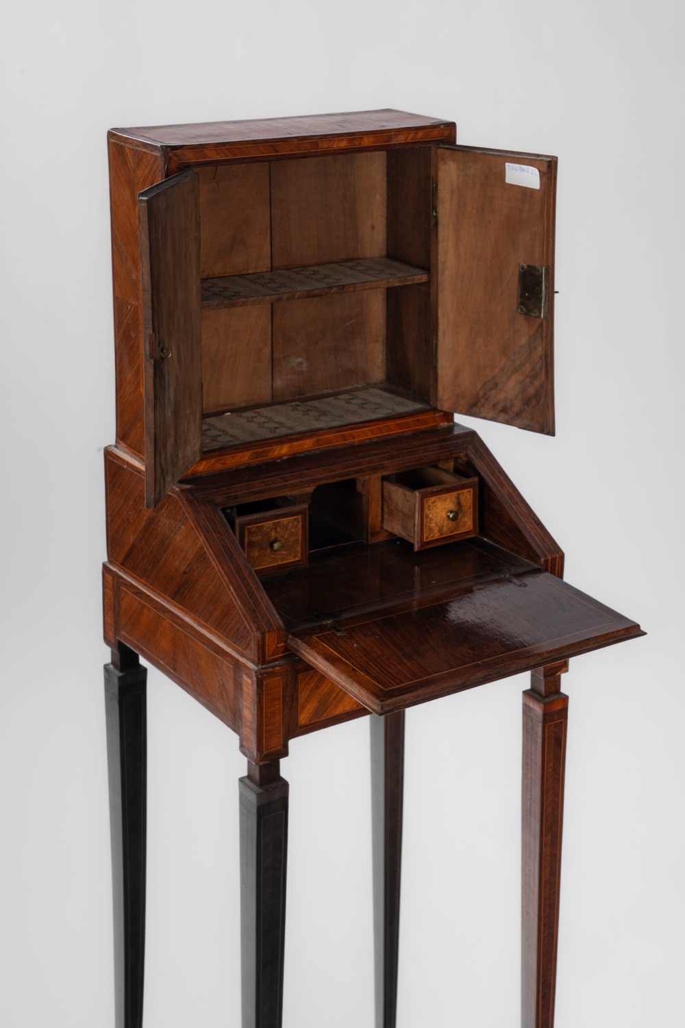 Scrittoio con alzata in miniatura in stile Luigi XVI lastronato, filettato e intarsiato a marqueterie