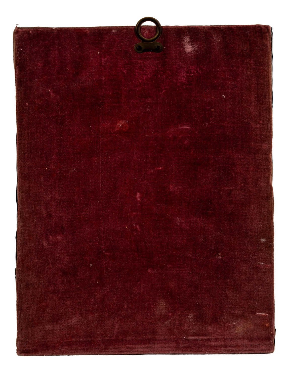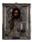 Cristo raffigurato a mezzo busto, benedicente, con Vangelo aperto recante iscrizione in slavo ecclesiastico. Fondo e bordura in argento sbalzato e cesellato con motivi floreali; aureola ornata da smalti policromi. Targhetta inferiore con iscrizione “Gospod’ Vsederžitel’”.
