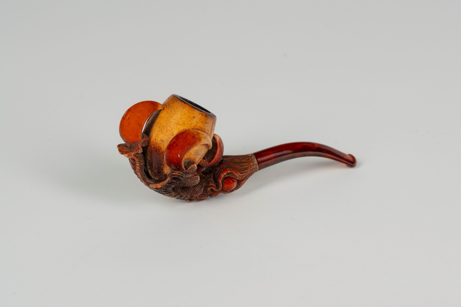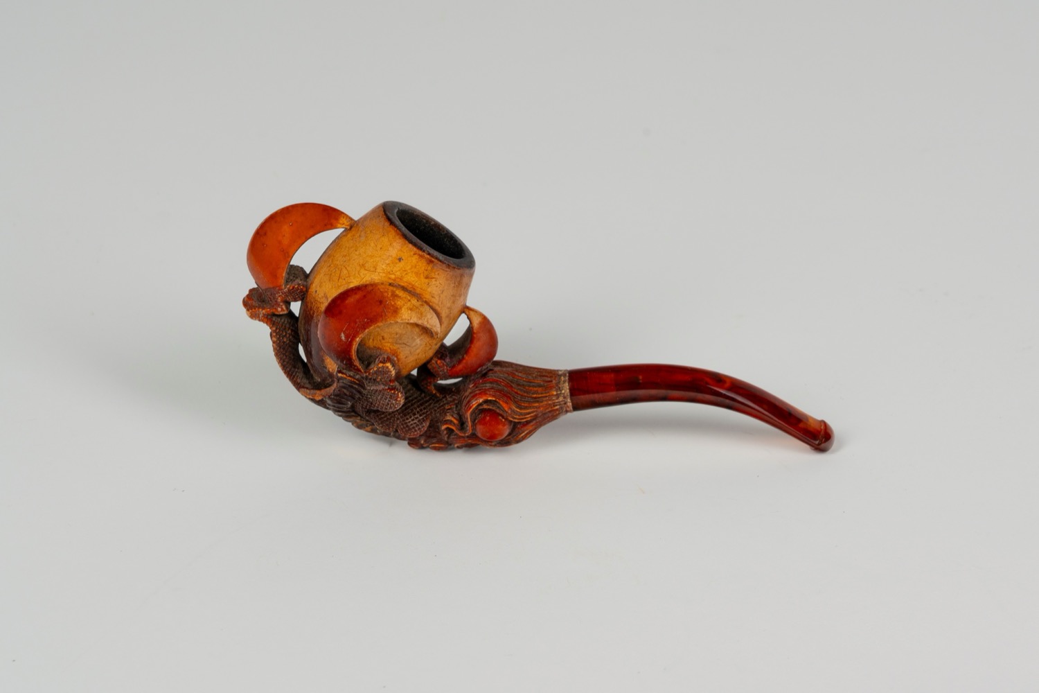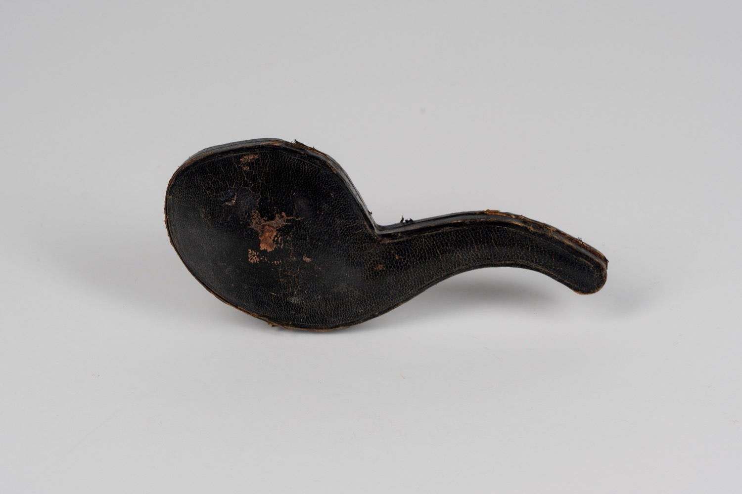 Pipa in schiuma di mare intagliata a forma di artiglio entro custodia sagomata. Secolo XIX