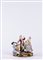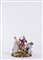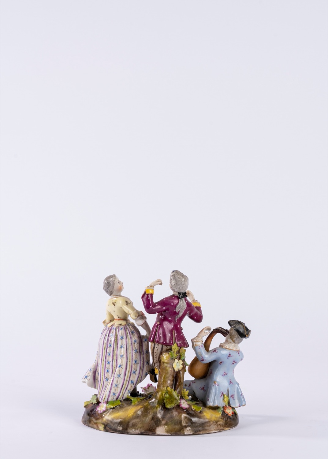 Gruppo in porcellana policroma raffigurante scena galante con suonatore di chitarra su zolla erbosa con fiori. Manifattura tedesca, fine secolo XIX/XX.