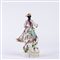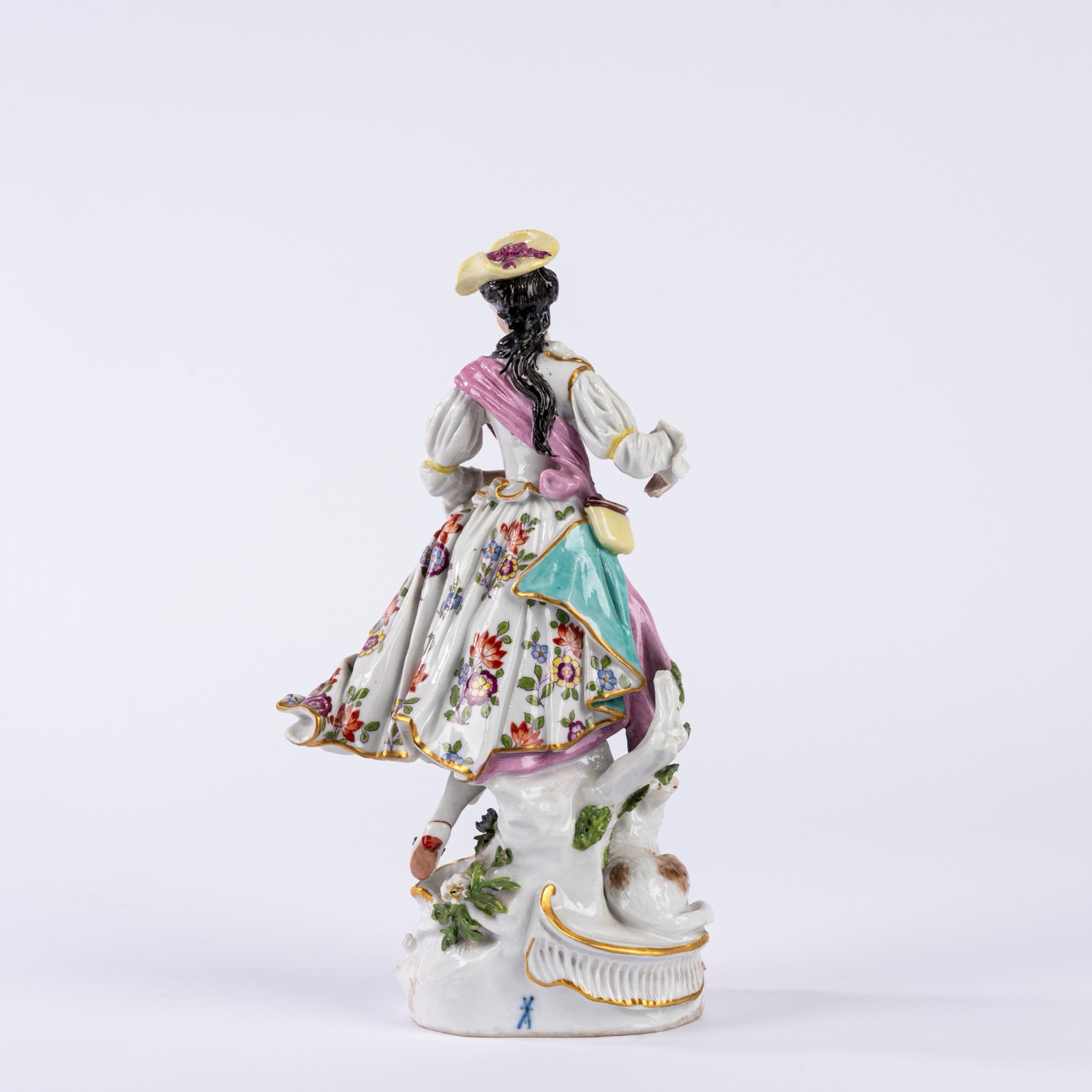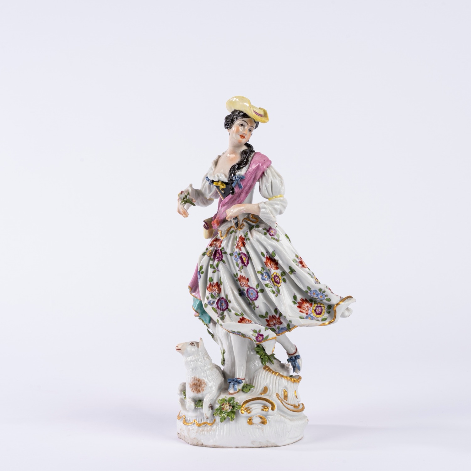 Gruppo in porcellana policroma raffigurante Pastorella con pecora su base ovale a rocaille. Manifattura di Samson, secolo XIX.