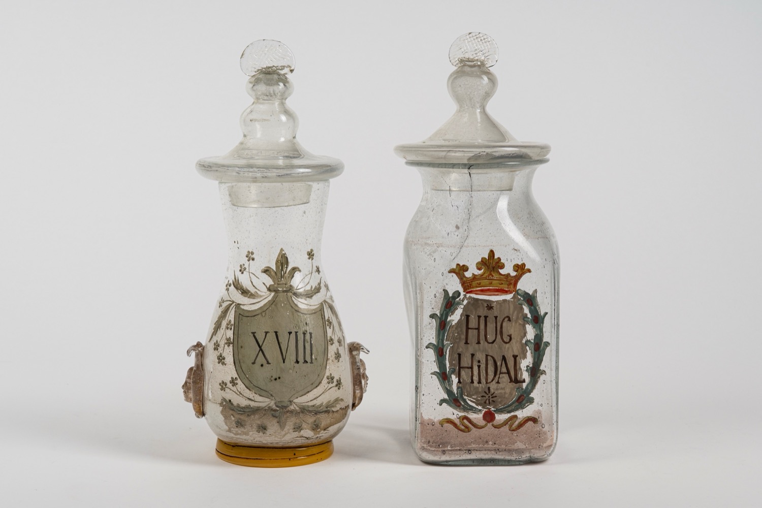 Due vasi da farmacia con coperchio in vetro incolore soffiato e dipinto, Venezia (?), fine secolo XVIII-XIX