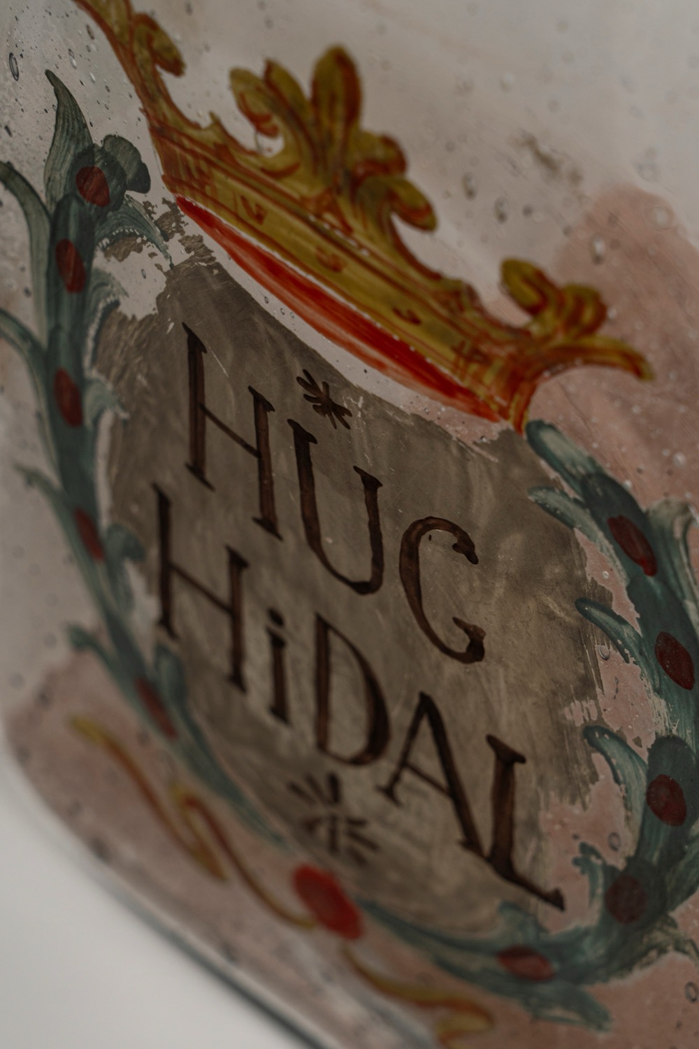 una biansata con volti femminili applicati e scudo dipinto con cifra romana, l'altro con stemma e scritta HUG HiDAL.una biansata con volti femminili applicati e scudo dipinto con cifra romana, l'altro con stemma e scritta HUG HiDAL.