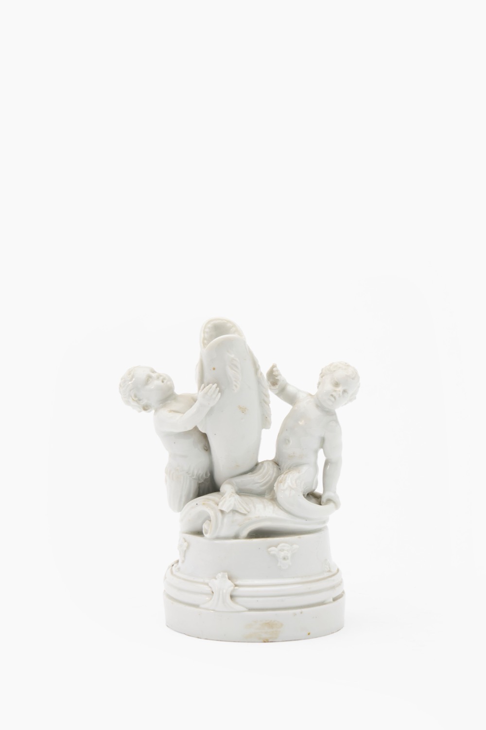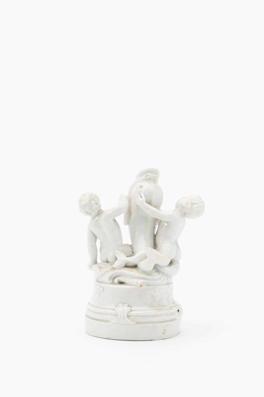 Gruppo in porcellana bianca raffigurante due putti tritoni che giocano con un delfino. Nove di Bassano, secolo XVIII.