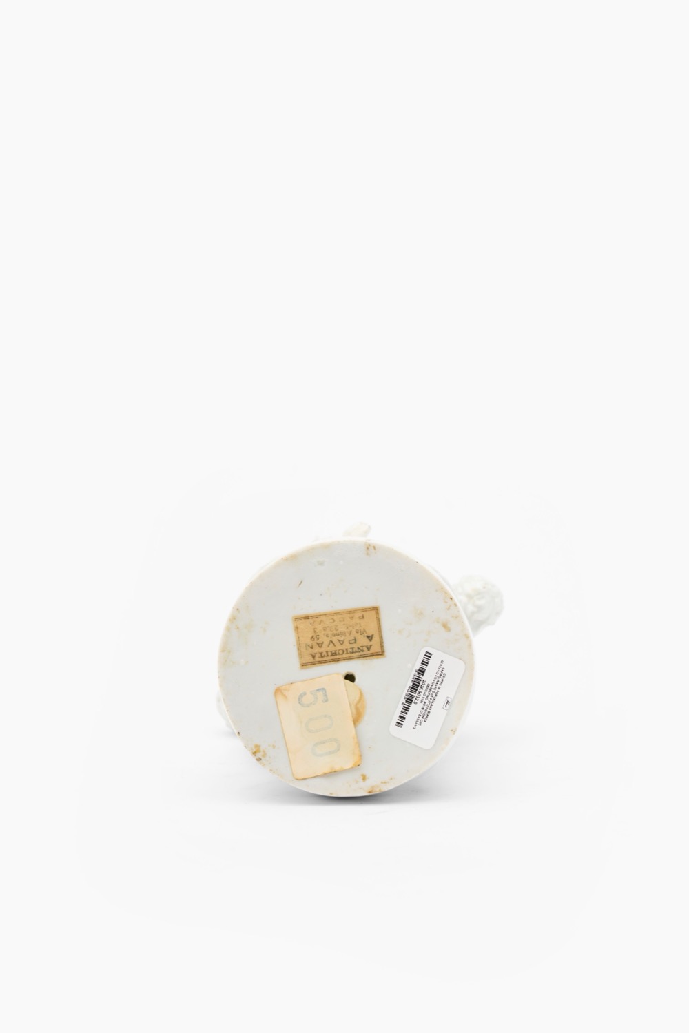 F. Stazzi, Le porcellane veneziane di Geminiano e Vincenzo Cozzi, p. 238, fig. 68 (il cui stesso modello si trova al Museo della Arti Decorative di Parigi)Su una base circolare a plinto decorata a piccoli mascheroni e volute di foglie. Lievi mancanze.