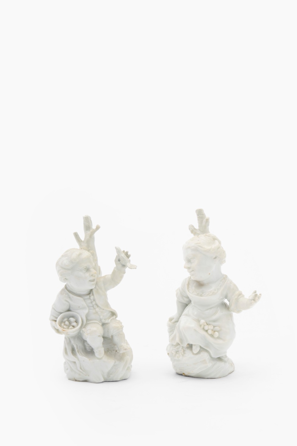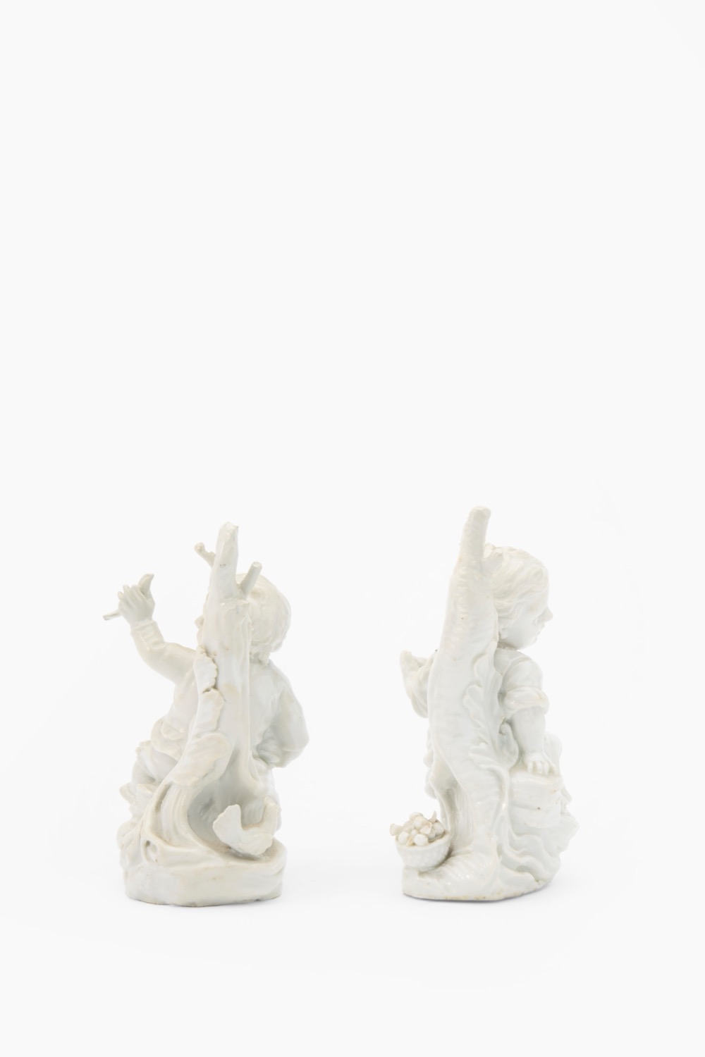 Coppia di nani contadini seduti ai piedi di un tronco d'albero con foglie. Manifattura di Cozzi, Venezia, secolo XVIII