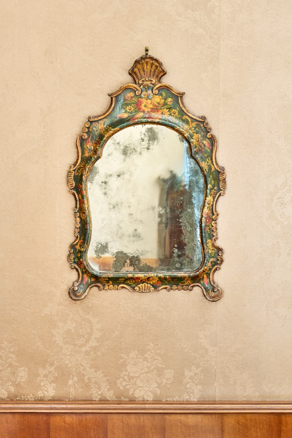 Fondo verde decorato a motivi floreali nei toni del giallo, dell'arancio e del rosso, piedini a ricciolo, cimasa sormontata da valva di conchiglia.
