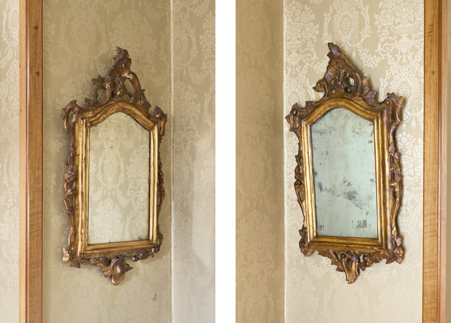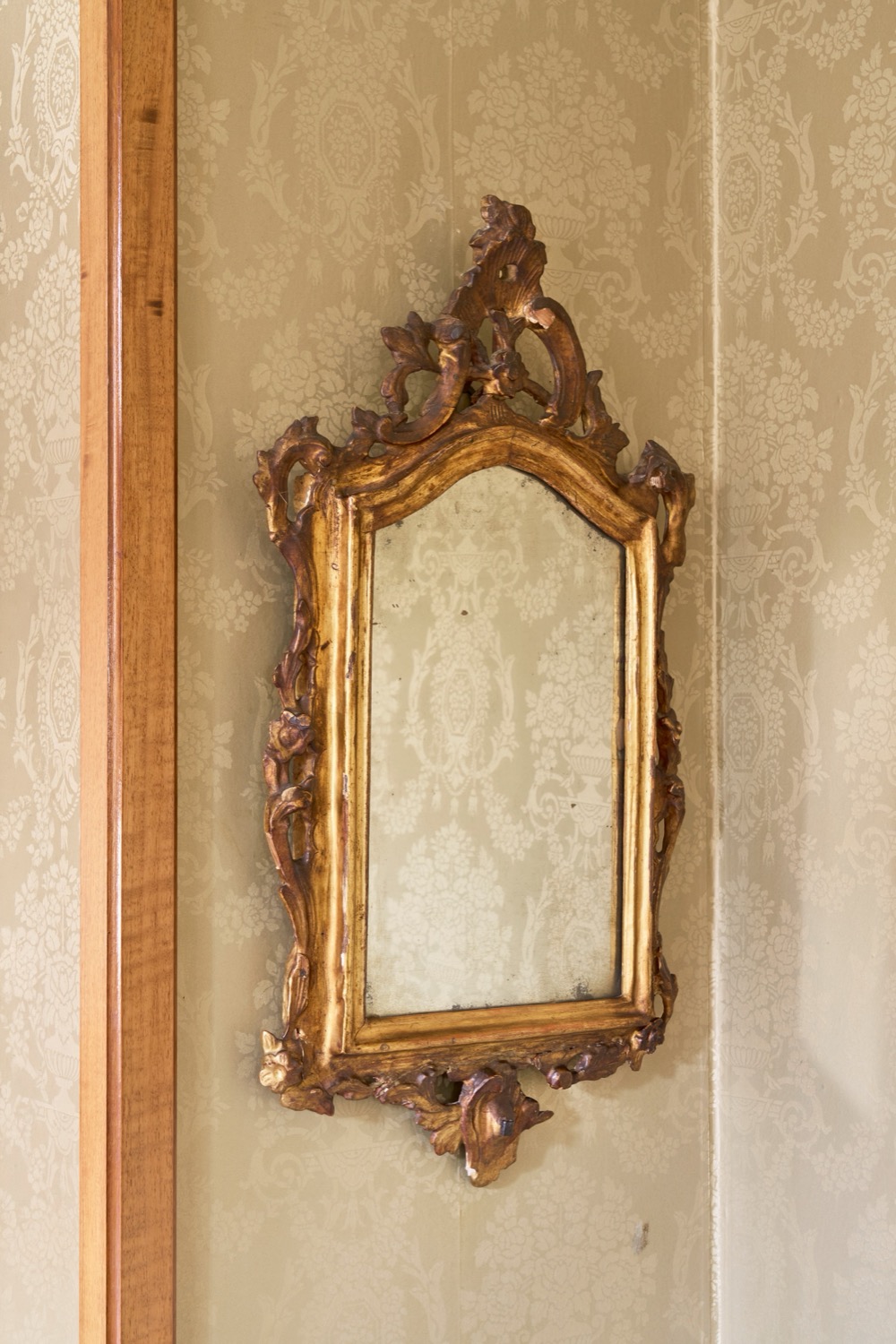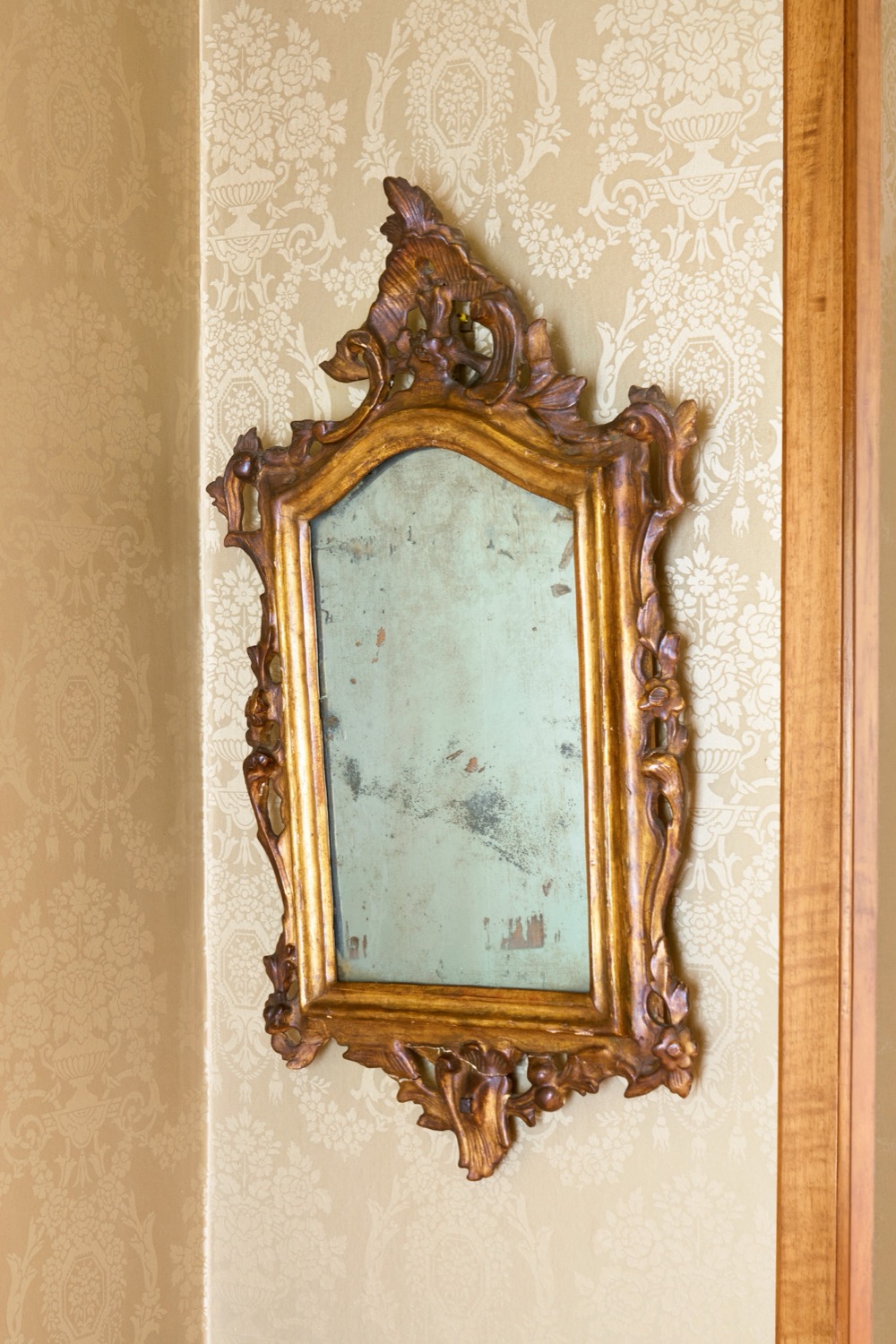 Difetti e restauri. Fregi a volute fogliate, frutti e fiori, cimasa traforata a valva di conchiglia.