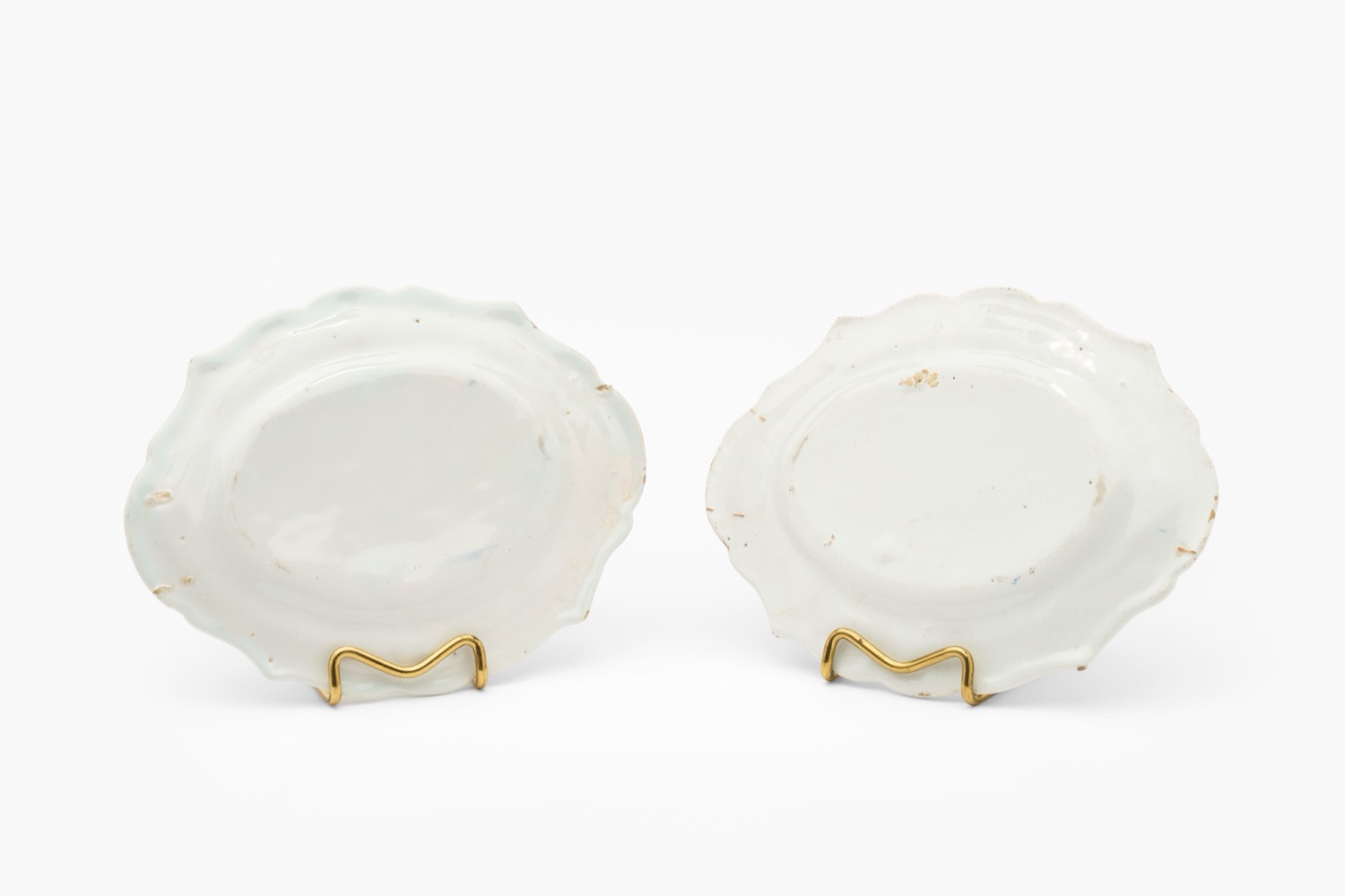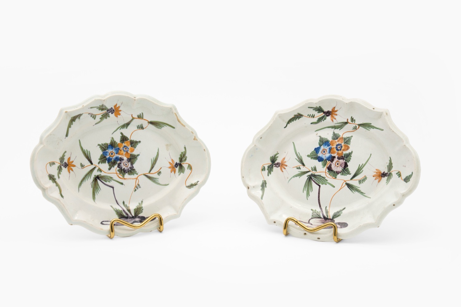 Coppia di vassoietti polilobati in maiolica policroma con decoro “a blanser”. Veneto, secolo XVIII