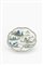 Sbeccature lungo il bordo. Decorazione a radice con graticcio e paesini cinesi con pagode e piramidi tra alberi e steli fioriti e fogliati. Profilo a rilievo con motivo vegetale.