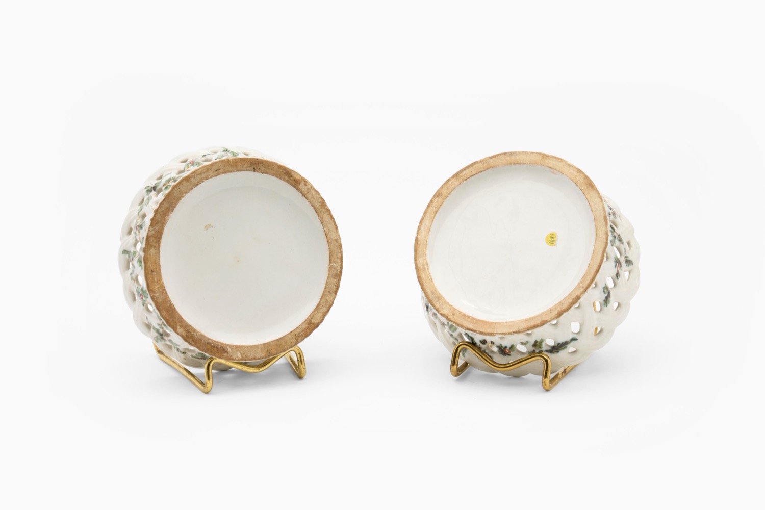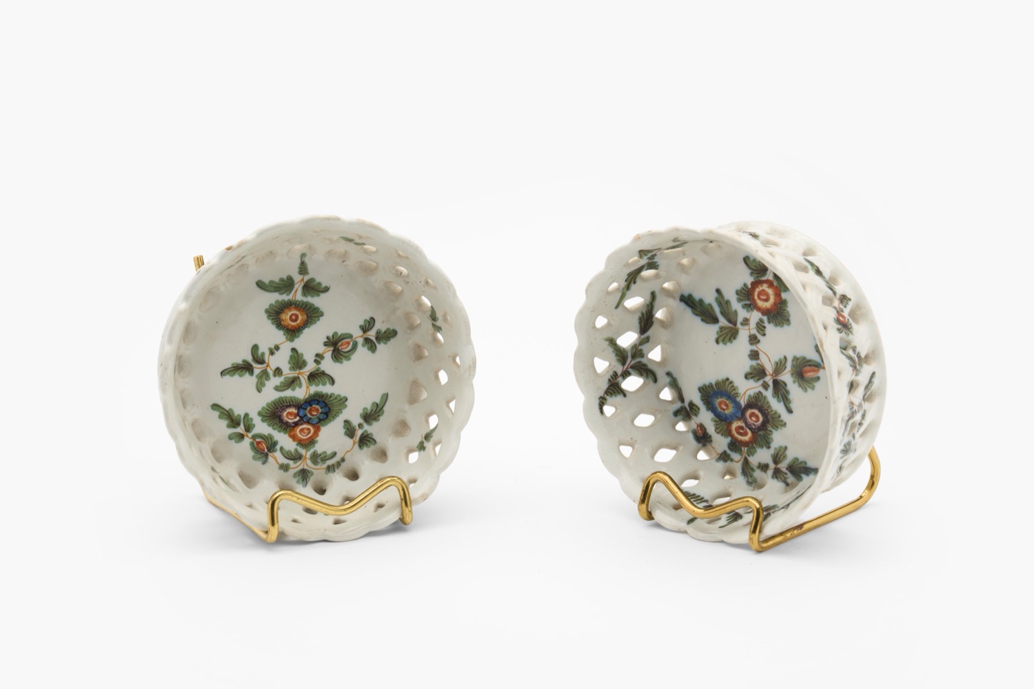 Coppia di cestini traforati in maiolica policroma con decoro “al blanser”. Manifattura Antonibon, Nove di Bassano, secolo XVIII