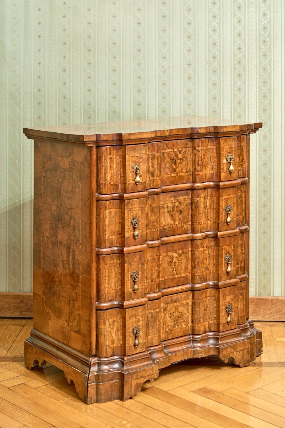 Fronte mosso a quattro cassetti, piedi a mensola.