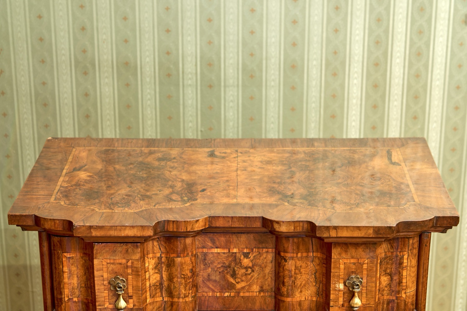 Elegante comoncino lastronato in noce, radica di noce e filettato. Venezia, secolo XVIII