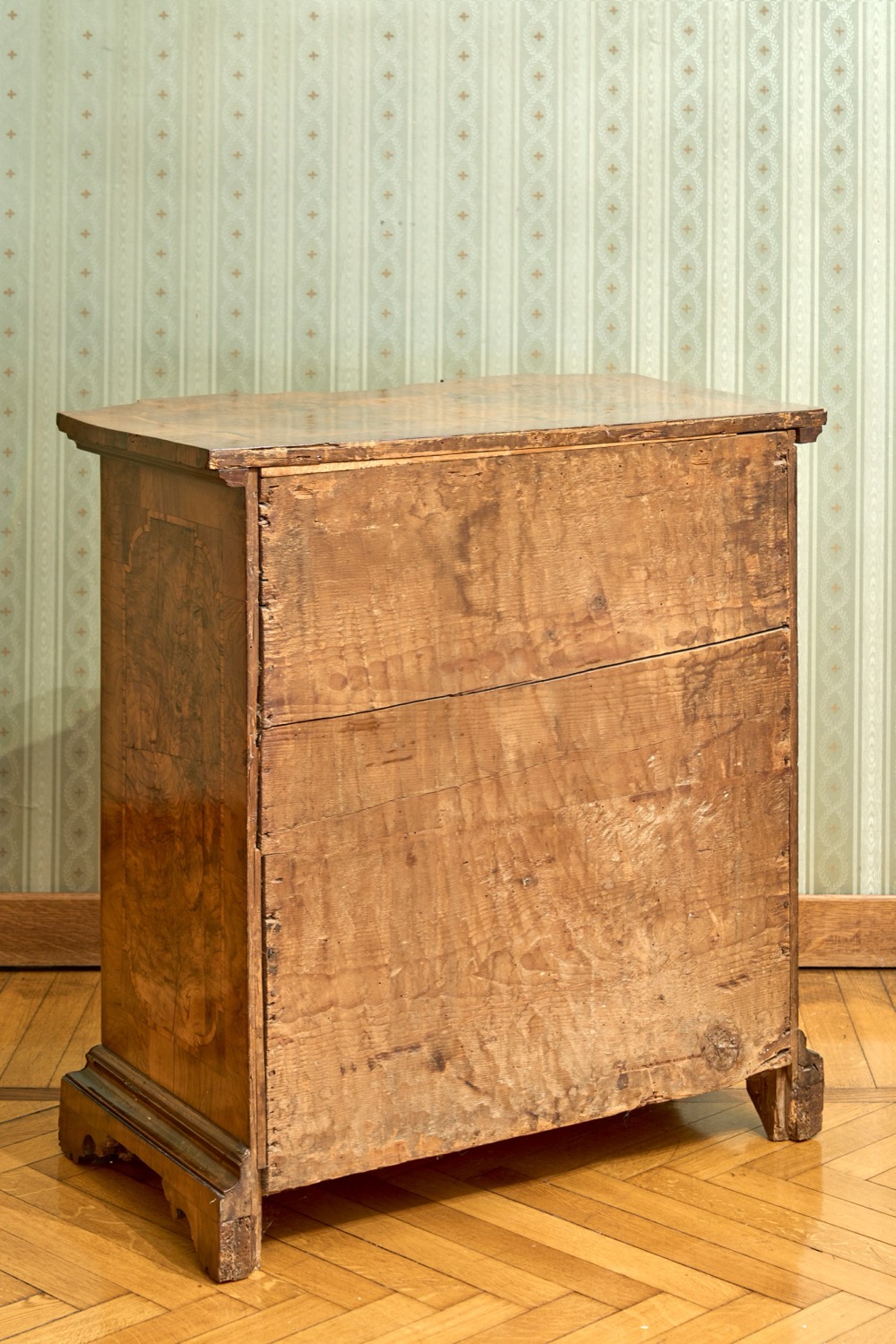Difetti. Fronte mosso a quattro cassetti, piedi a mensola.