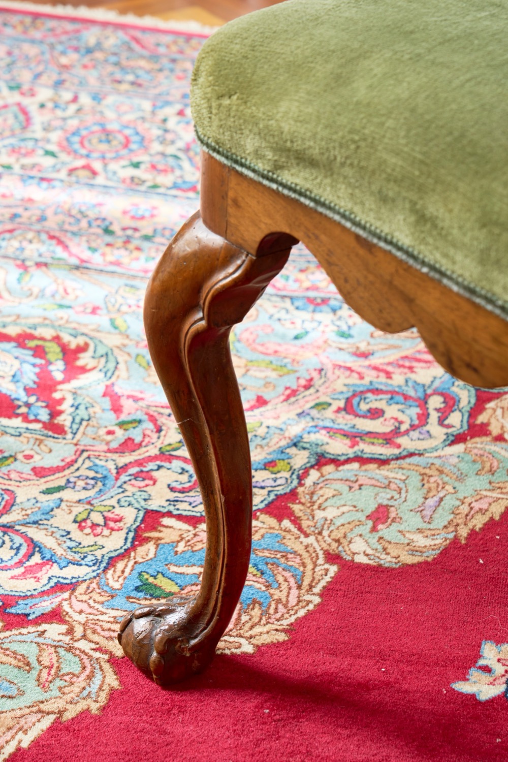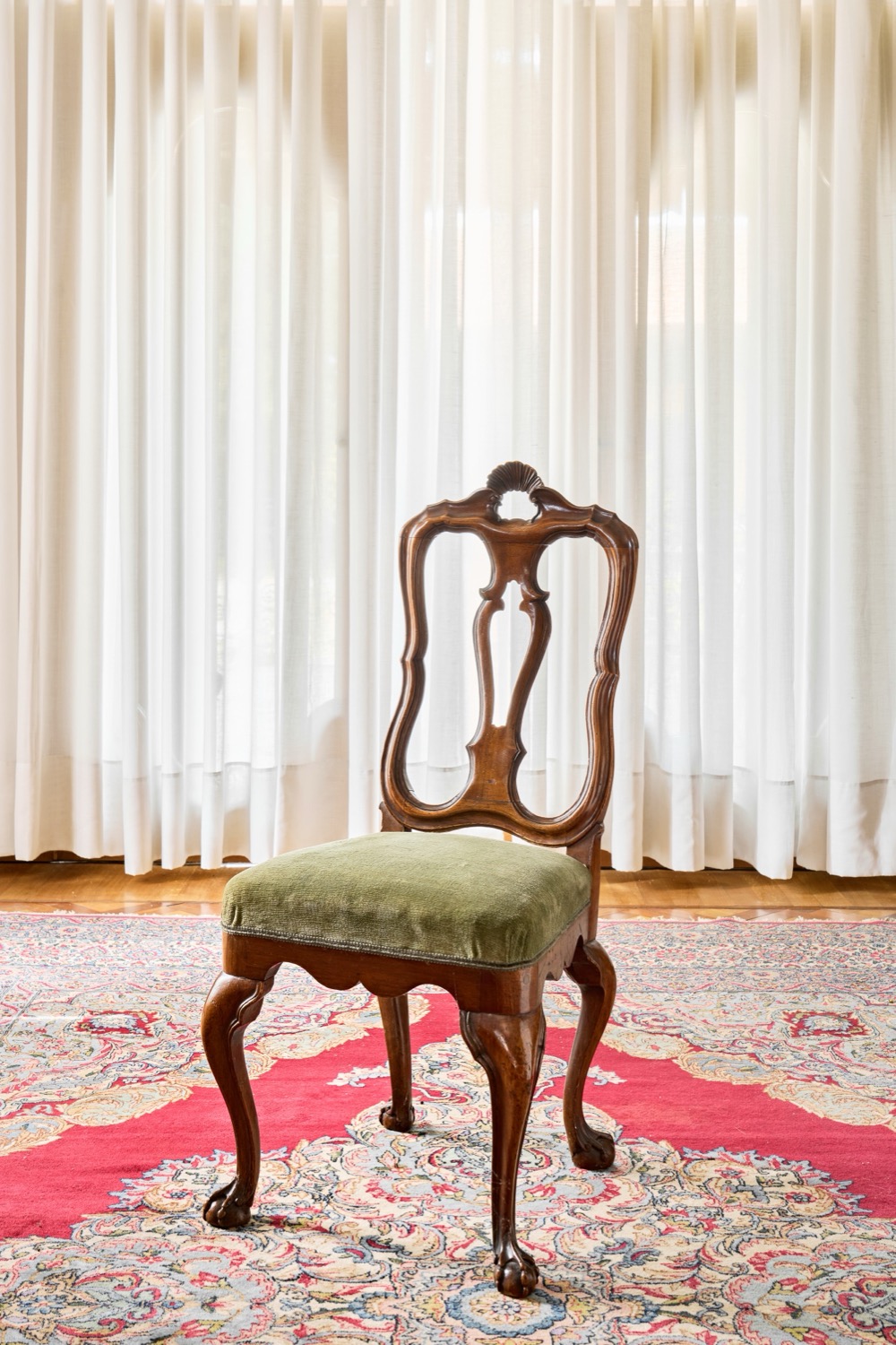 Di forma mossa con schienale a cartella traforata, le sedie con piede ad artiglio su sfera. Di decoro lievemente differenteDi forma mossa con schienale a cartella traforata, le sedie con piede ad artiglio su sfera. Di decoro lievemente differente