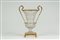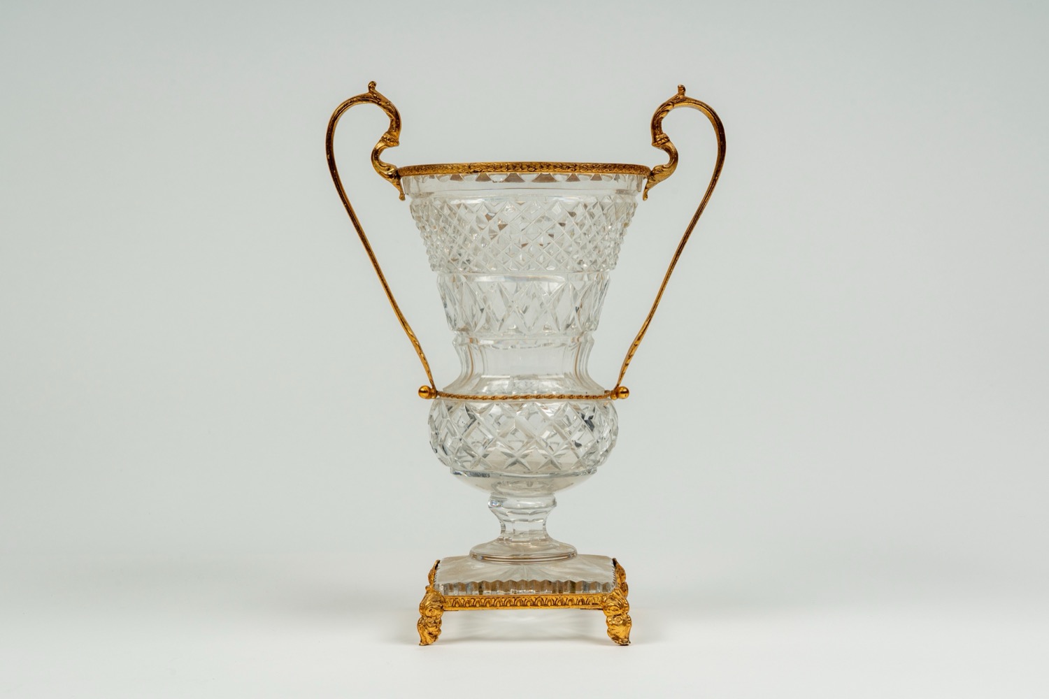 Vaso biansato in cristallo molato montato in bronzo dorato su base quadrata poggiante su quattro piedini a volute. Fine secolo XIX-inizio XX