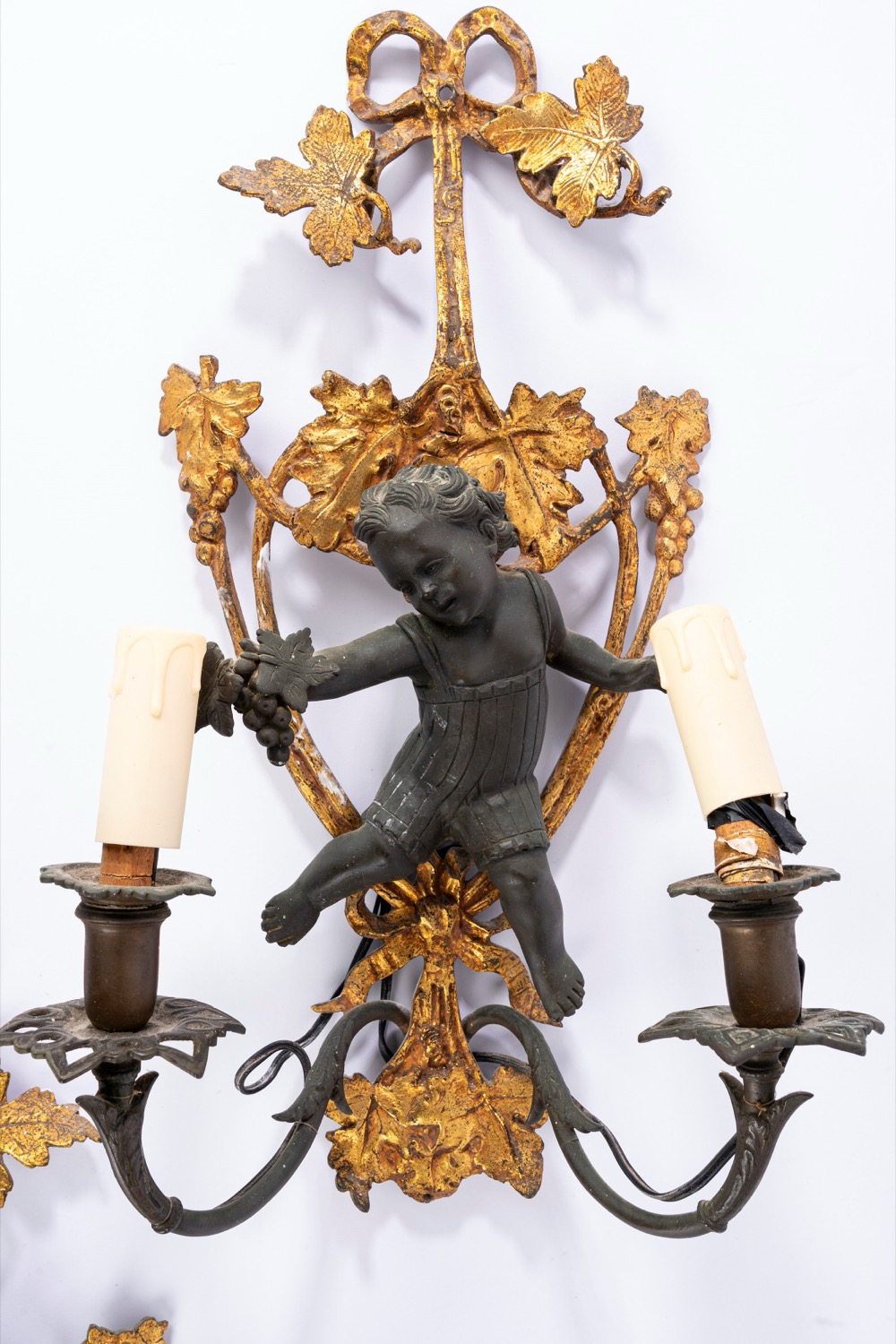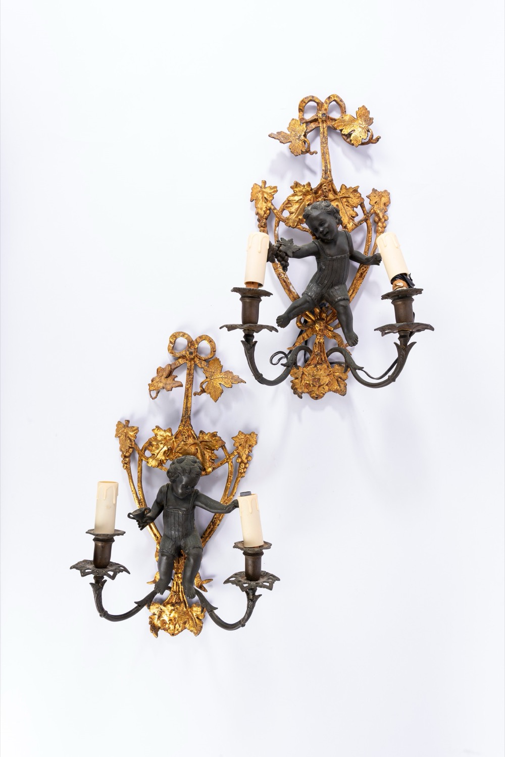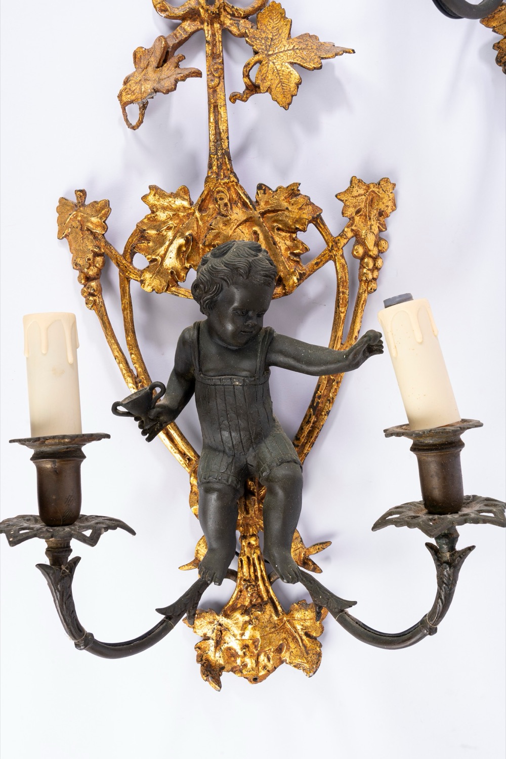 Coppia di appliques a due luci in bronzo dorato e patinato con sostegno decorato da putto a rilievo. Secolo XVIII o XIX.
