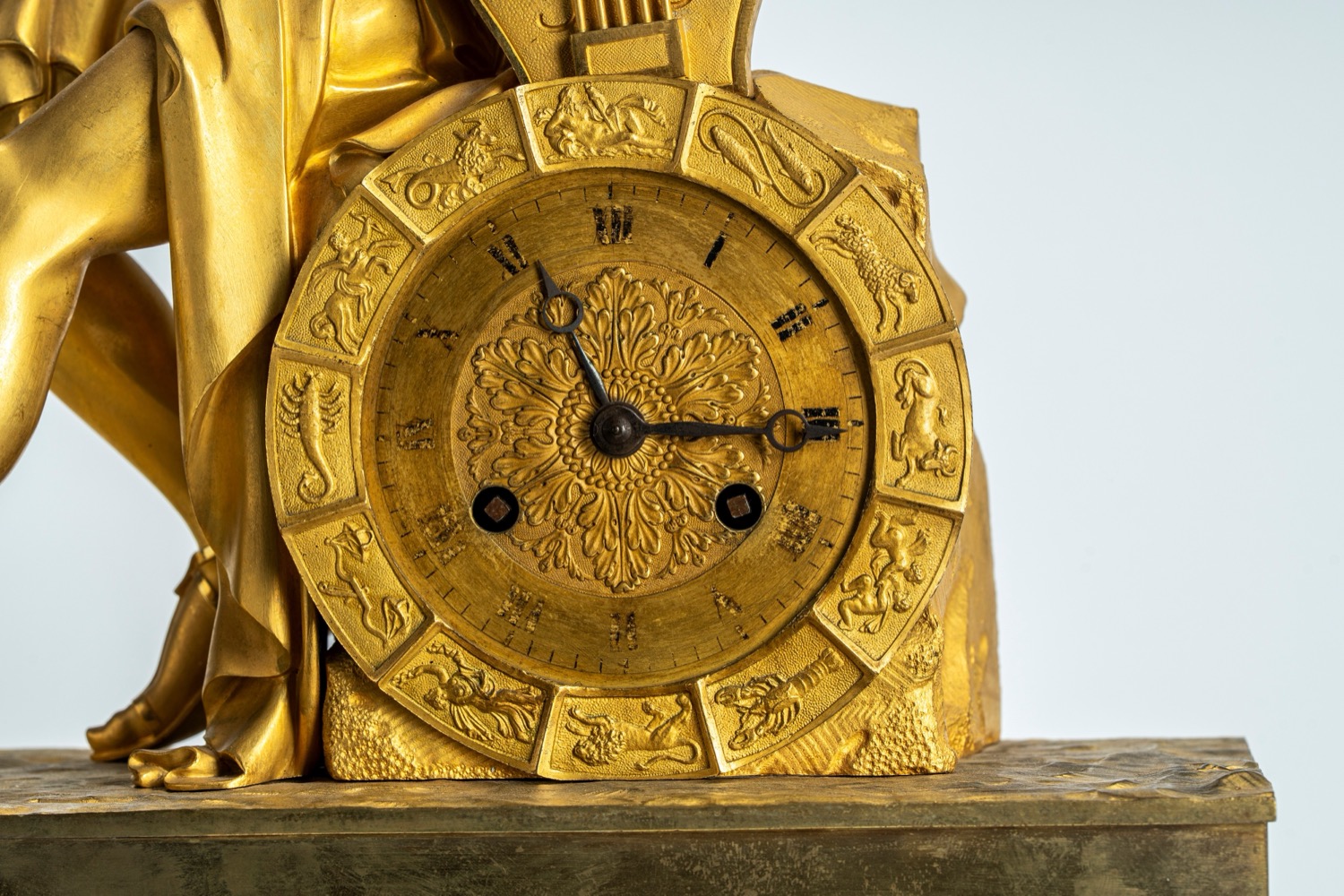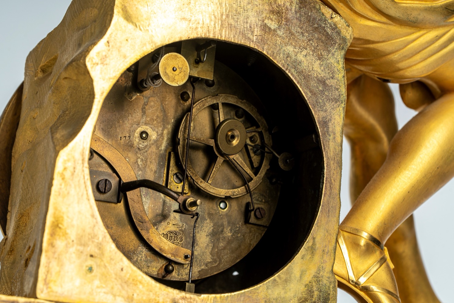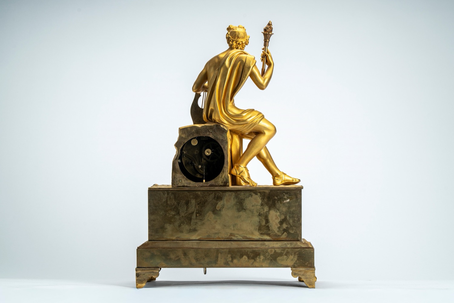 Mancanza della lunetta posteriore di protezione del movimento. base a plinto con fregio di gusto neoclassico a bassorilievo con piedini anteriori ferini. Apollo seduto su una roccia contenente il quadrante dorato a numeri romani con lancette del tipo "Breguet" e fascia con segni zodiacali. Meccanismo firmato "Pons", attribuibile a Pierre-César Honoré Pons, a carica settimanale, dotato di sistema di blocco e riattivazione automatica della suoneria nelle ore notturne.