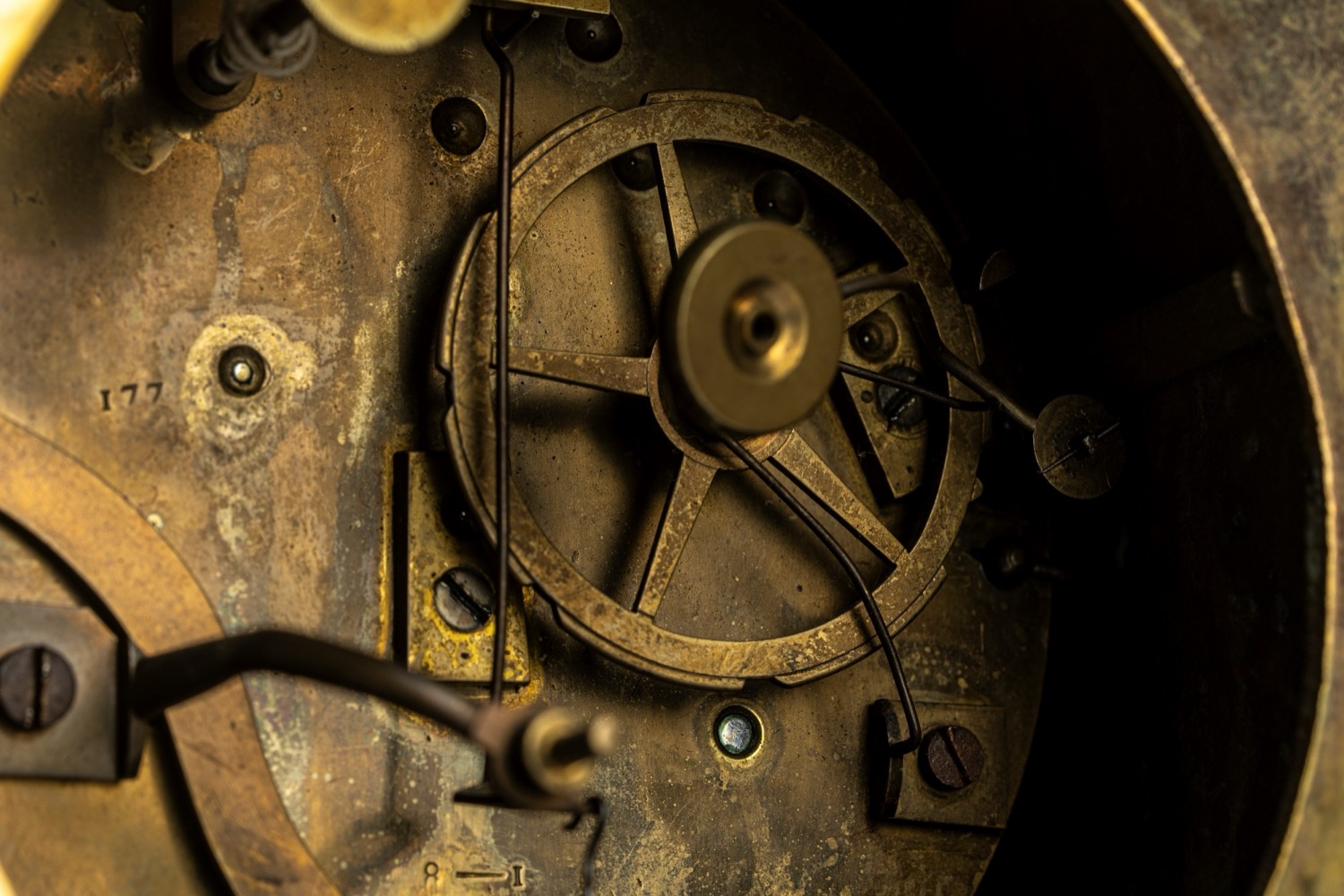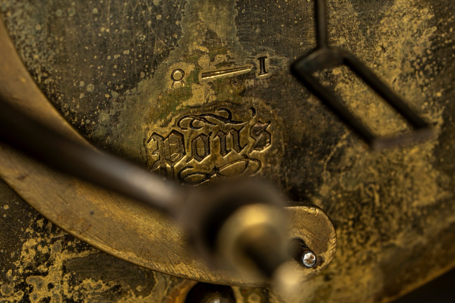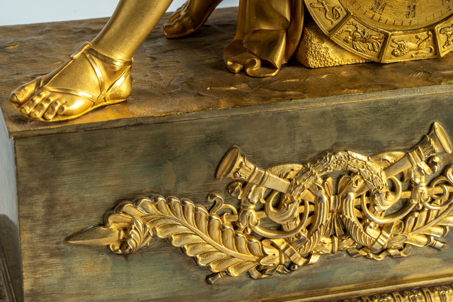 Mancanza della lunetta posteriore di protezione del movimento. base a plinto con fregio di gusto neoclassico a bassorilievo con piedini anteriori ferini. Apollo seduto su una roccia contenente il quadrante dorato a numeri romani con lancette del tipo "Breguet" e fascia con segni zodiacali. Meccanismo firmato "Pons", attribuibile a Pierre-César Honoré Pons, a carica settimanale, dotato di sistema di blocco e riattivazione automatica della suoneria nelle ore notturne.