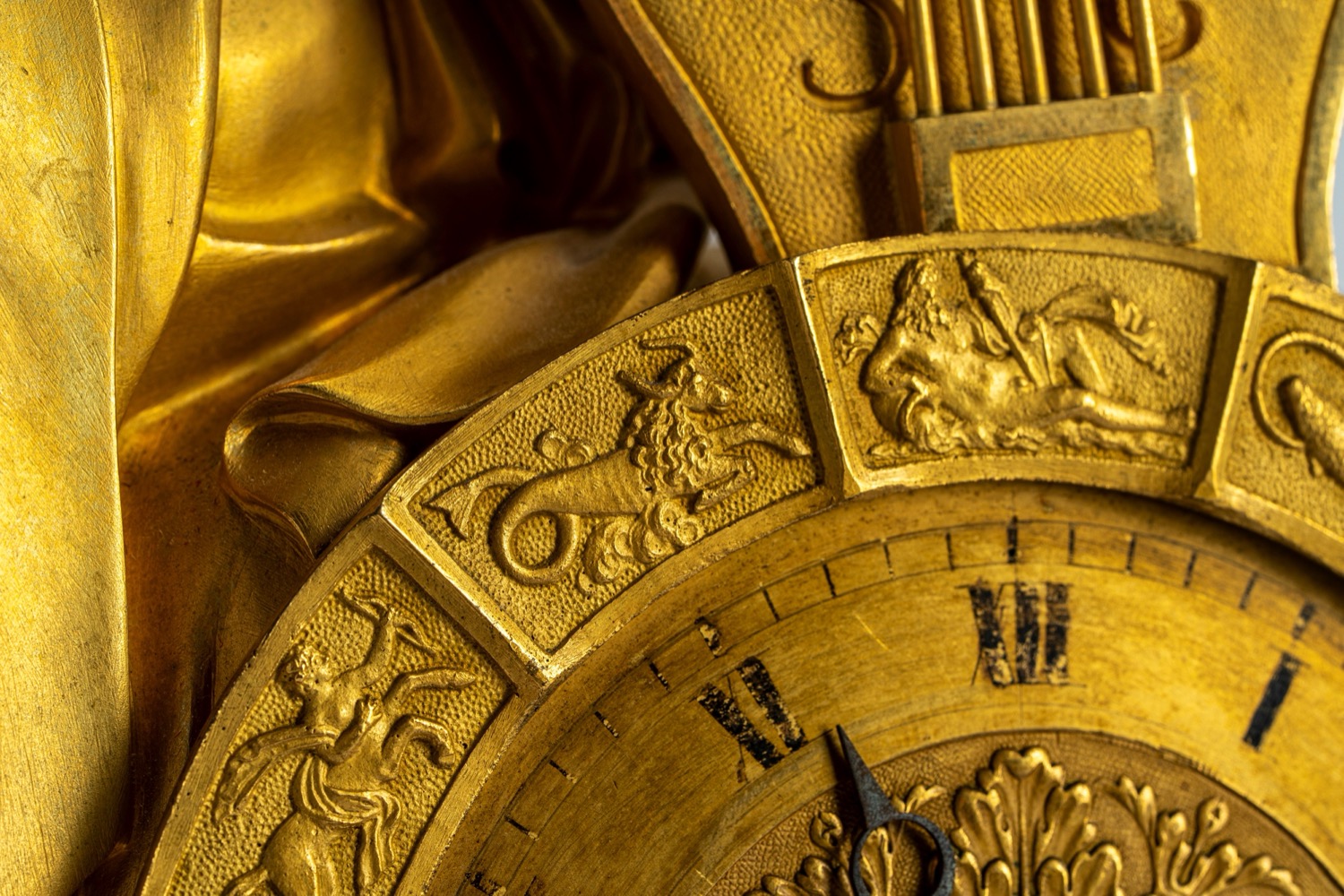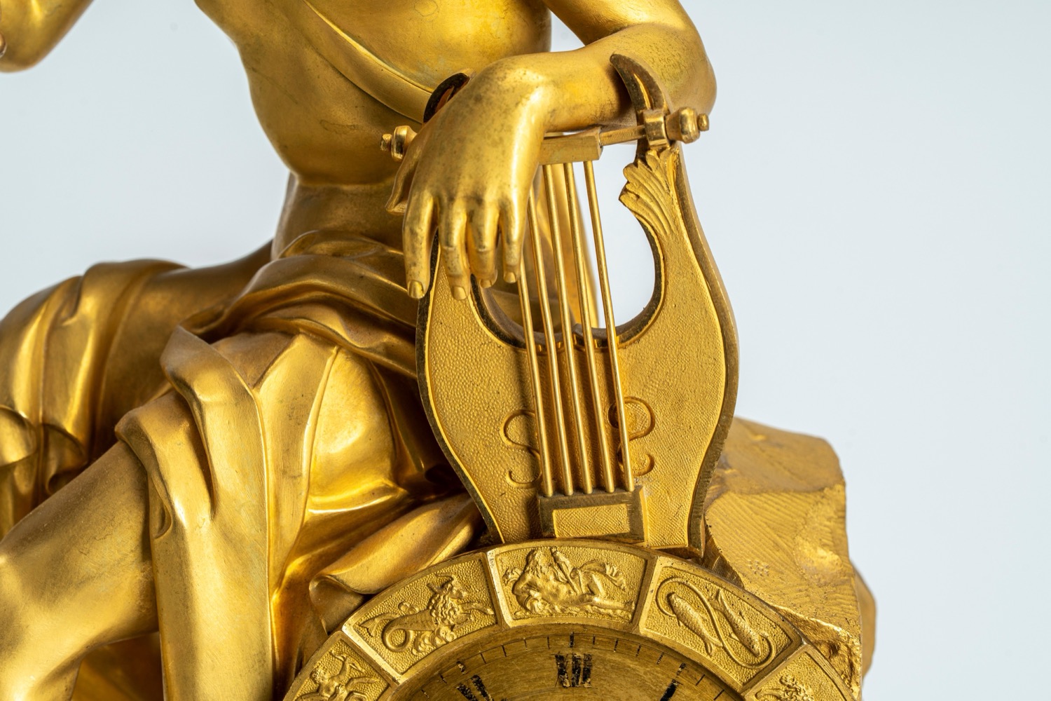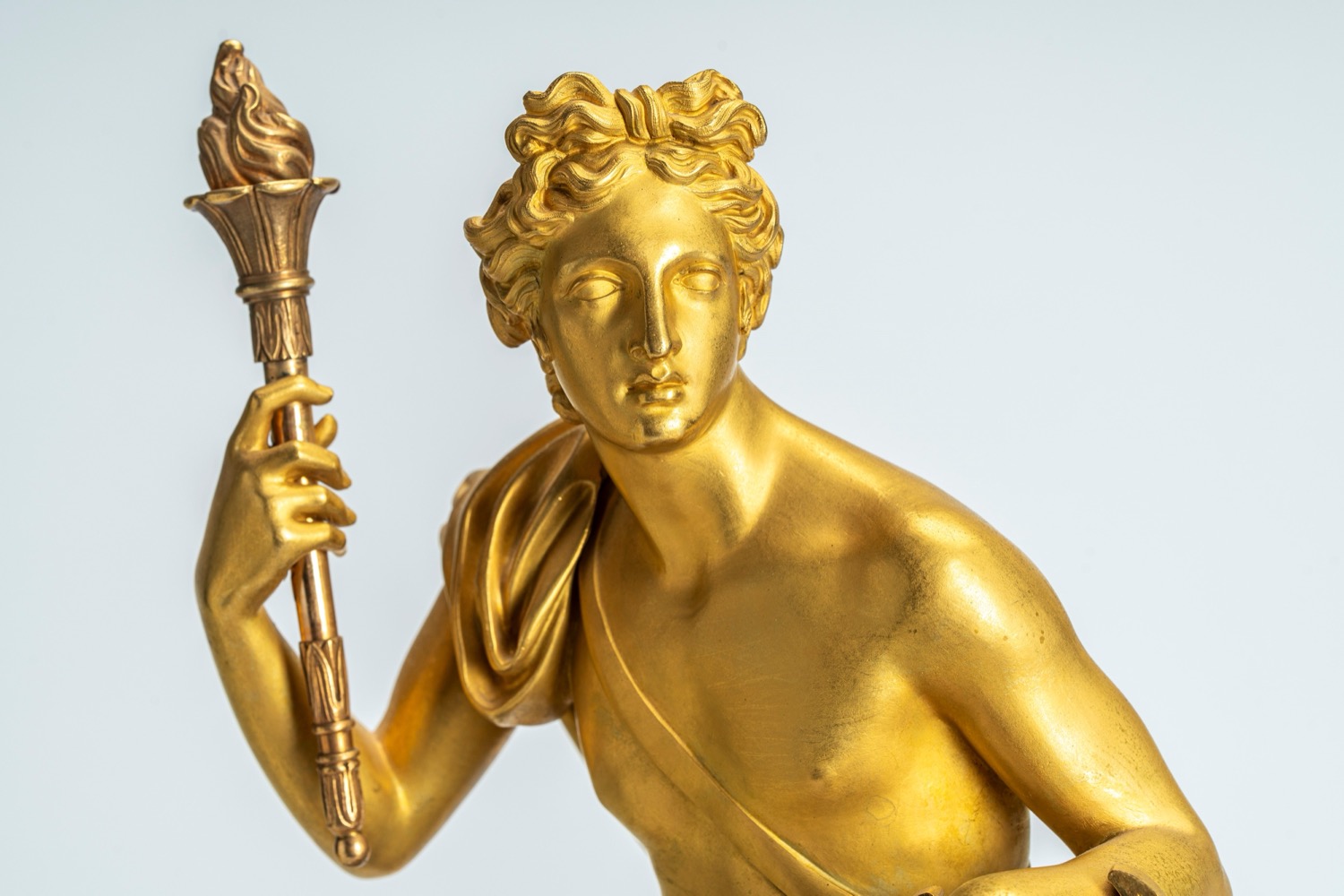 Pendola da tavolo in bronzo dorato raffigurante Apollo. Francia, circa 1830