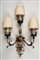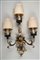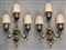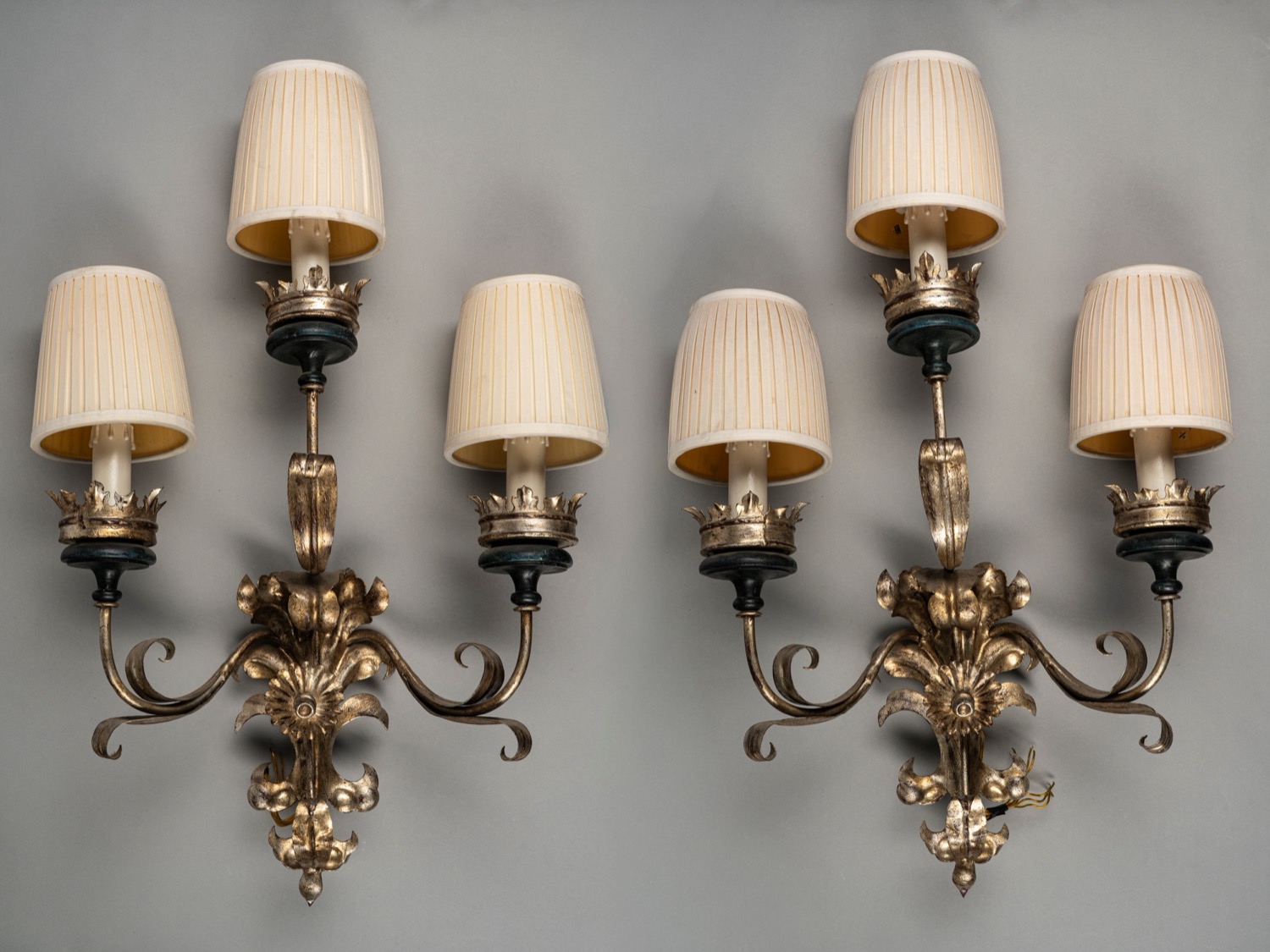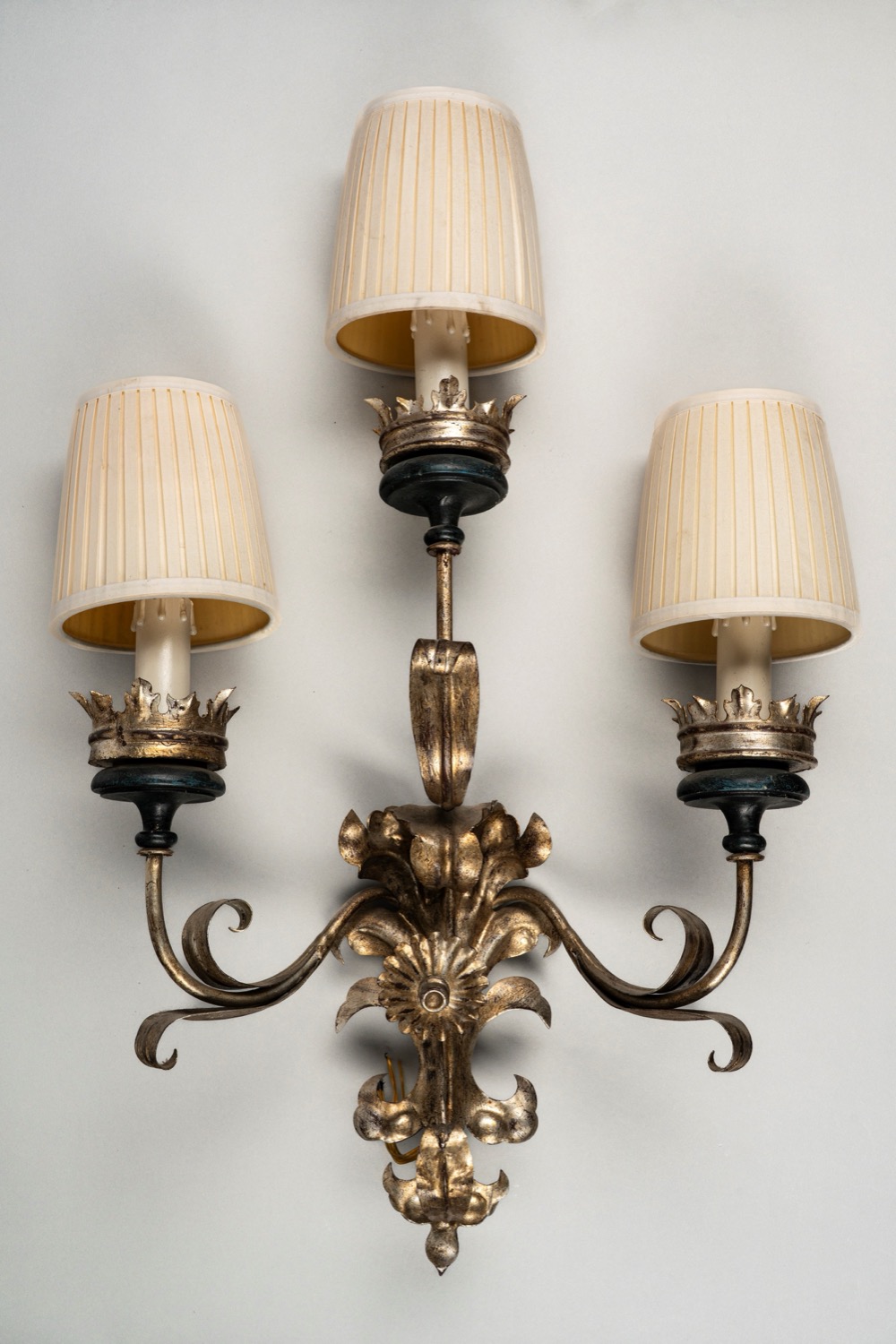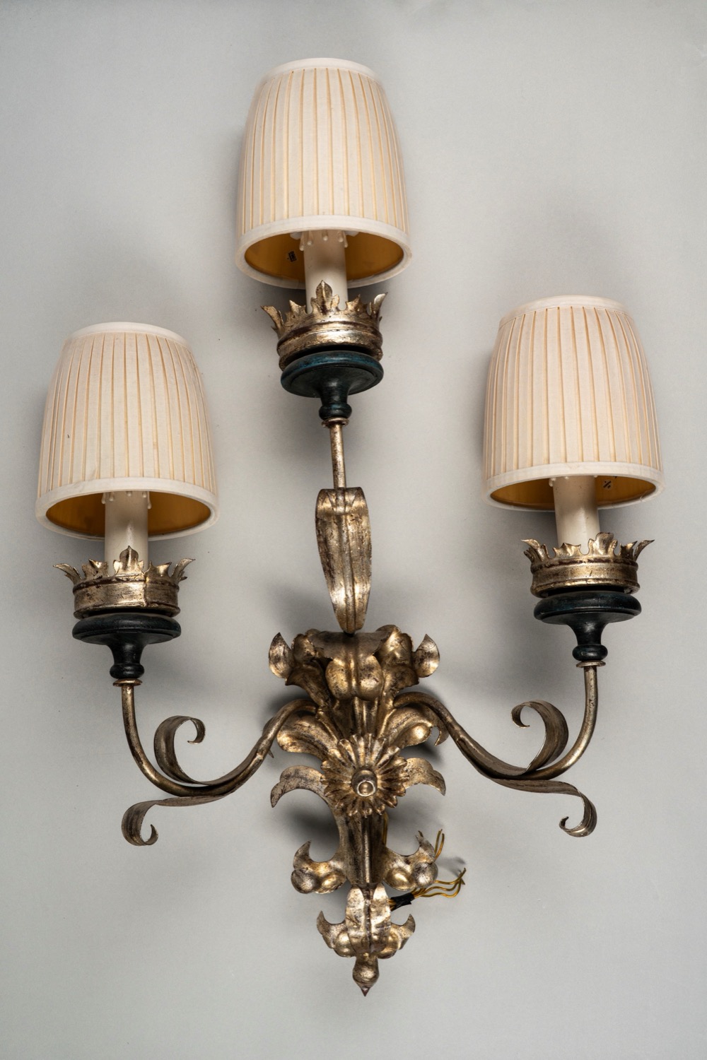Coppia di appliques in metallo argentato a tre luci con bracci mossi a volute di foglie e fiori