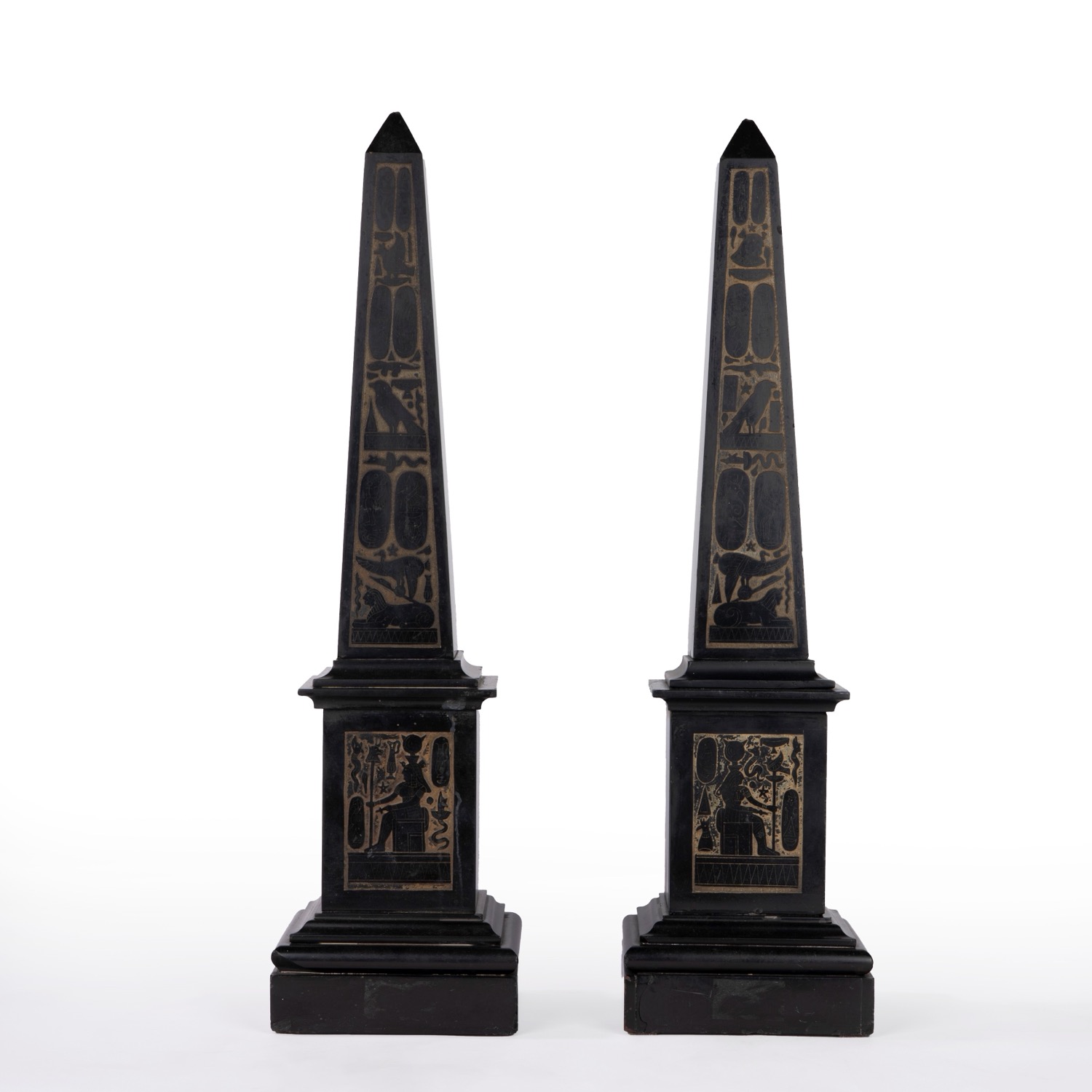 Coppia di obelischi in marmo nero ornati a bassorilievo a motivi egizi