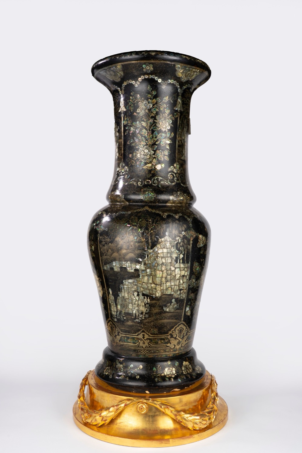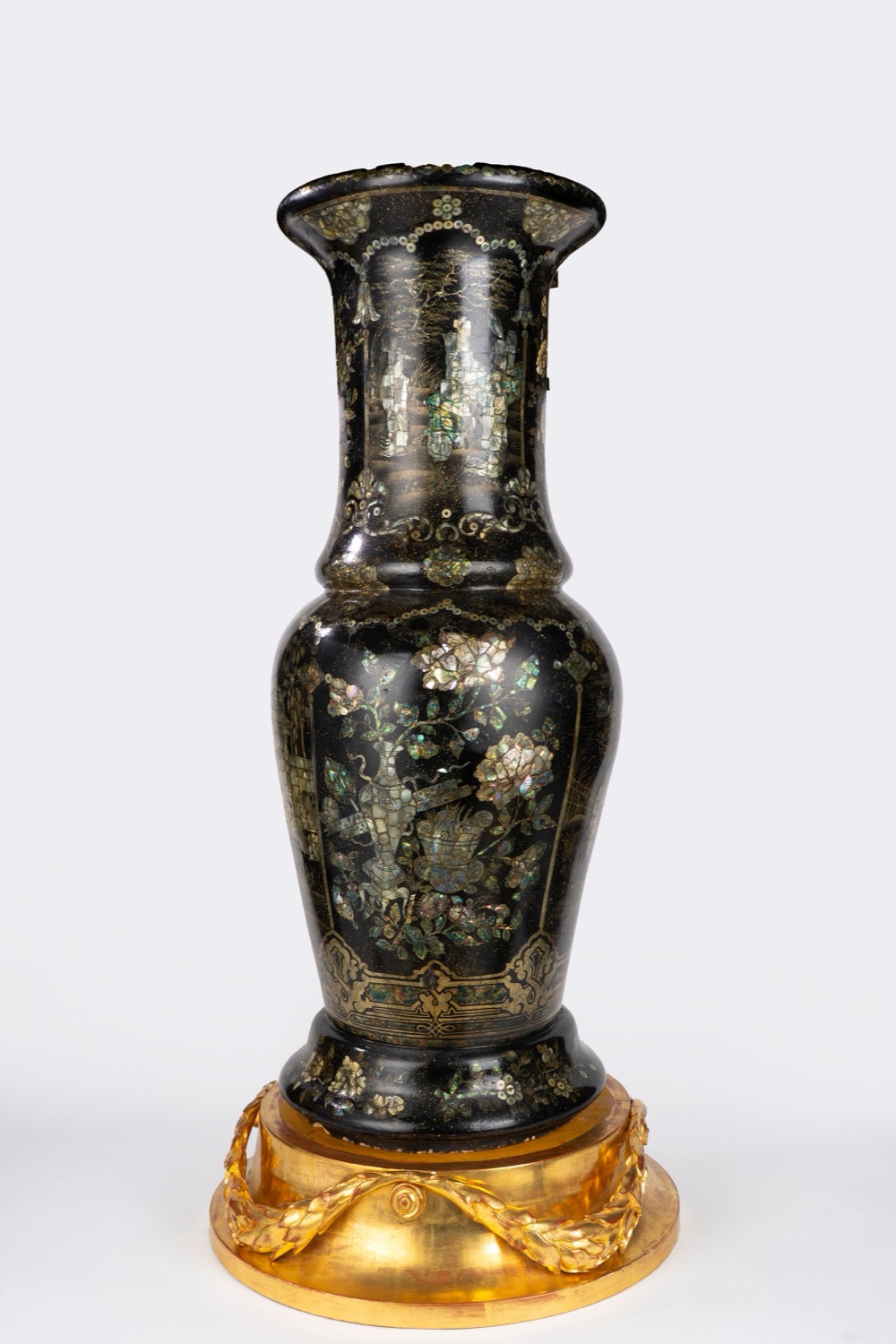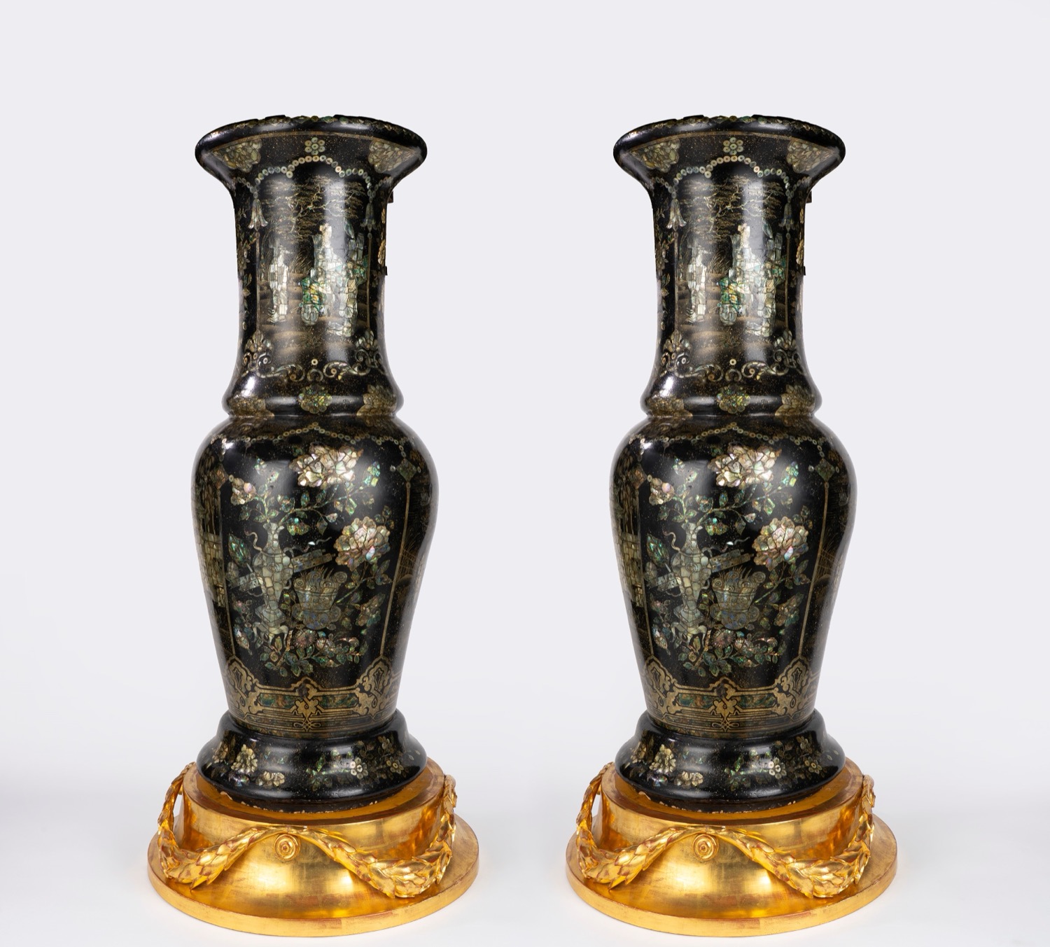 Lot 183 | Coppia di grandi vasi cinesi a tromba in porcellana nera con intarsi in madreperla e metallo dorato. Fine secolo XIX