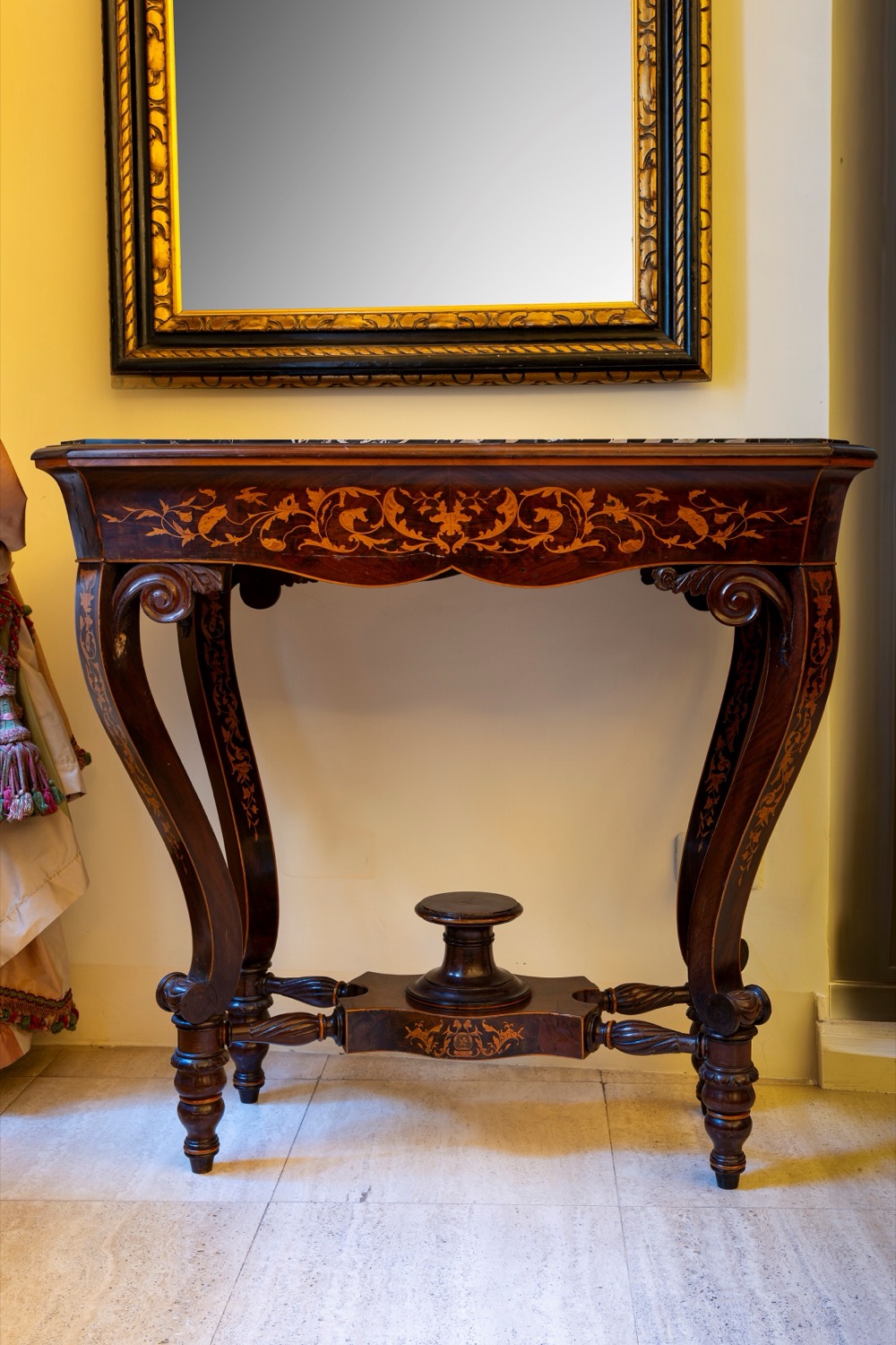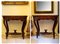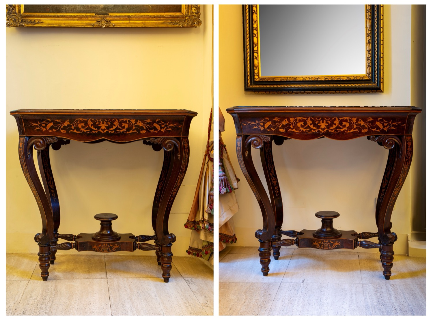 Coppia di consoles Carlo X lastronate in mogano e intarsiate a motivo floreale con piano in marmo portoro incassato. Francia, secolo XIX